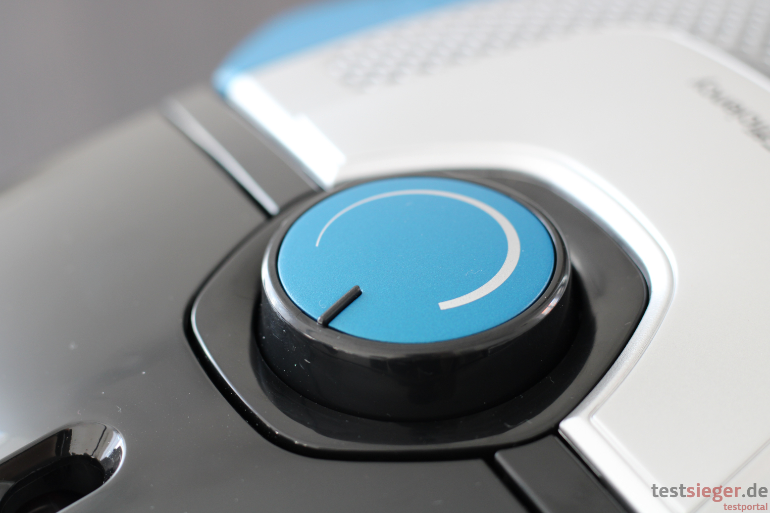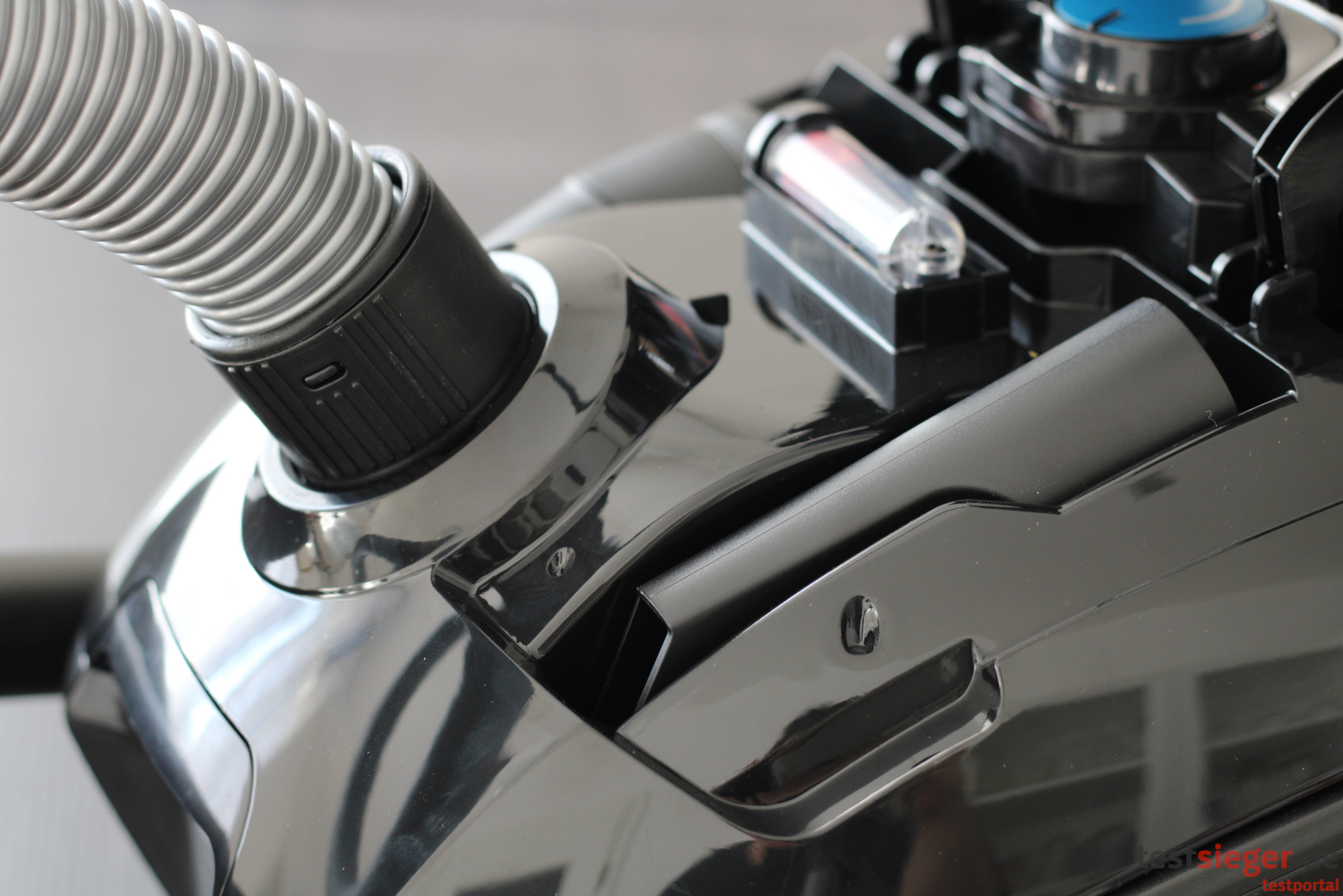 Bedienung und Handhabung sind so gut wie selbsterklärend. Wer schon einmal einen herkömmlichen Bodenstaubsauger verwendet hat, kommt sofort zurecht. Am Gehäuse selbst befinden sich die Start/Stopp-Taste und der Knopf für den mechanischen Kabeleinzug. Die Bedienelemente sind angenehm groß und lassen sich problemlos mit dem Fuß betätigen. Hinzu kommt ein stufenloses Drehrad für die Saugleistung. Wir hätten uns jedoch noch eine Skalierung gewünscht, um besser einschätzen zu können, auf welcher Stufe wir gerade saugen.