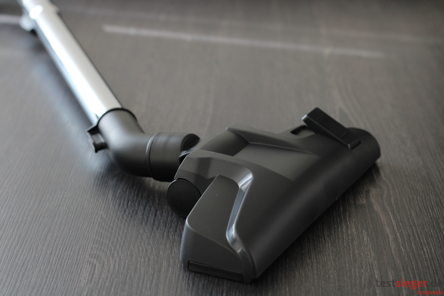 Die Universaldüse für Teppich- und Hartböden läuft recht angenehm über den Boden – vorausgesetzt die Tritttaste an der Düse ist auf den richtigen Belag eingestellt. Selbst auf der höchsten Stufe lässt sich der Sauger auf Hartboden jederzeit problemlos manövrieren. Auf Teppich saugt er sich etwas fest, lässt sich mit etwas mehr Krafteinsatz aber immer noch gut bewegen. Für eine noch bessere Manövrierfähigkeit befindet sich ein Luftauslass am Griff, dann leidet aber natürlich die Saugleistung etwas. Wir halten die Öffnung während unserer gesamten Testphase geschlossen. Die Düse verfügt über ein Gelenk und lässt sich um 45 Grad nach links und rechts drehen. Damit ist keine perfekte Flexibilität gegeben, der Staubsauger kommt aber trotzdem in die meisten Ecken.