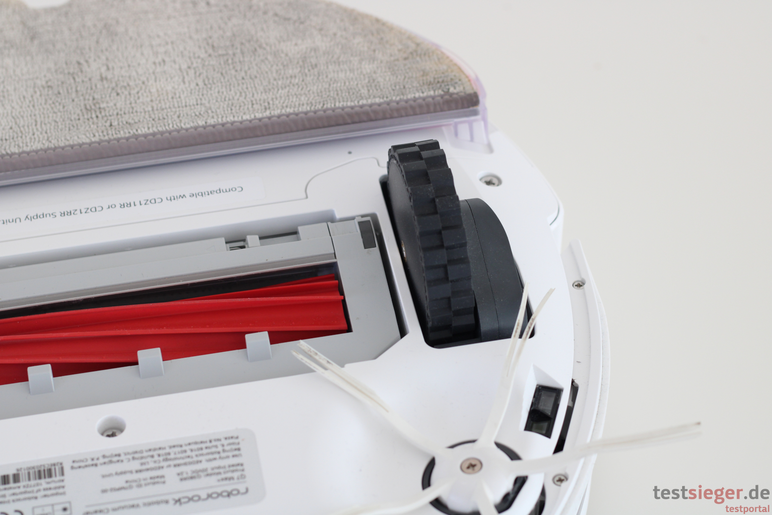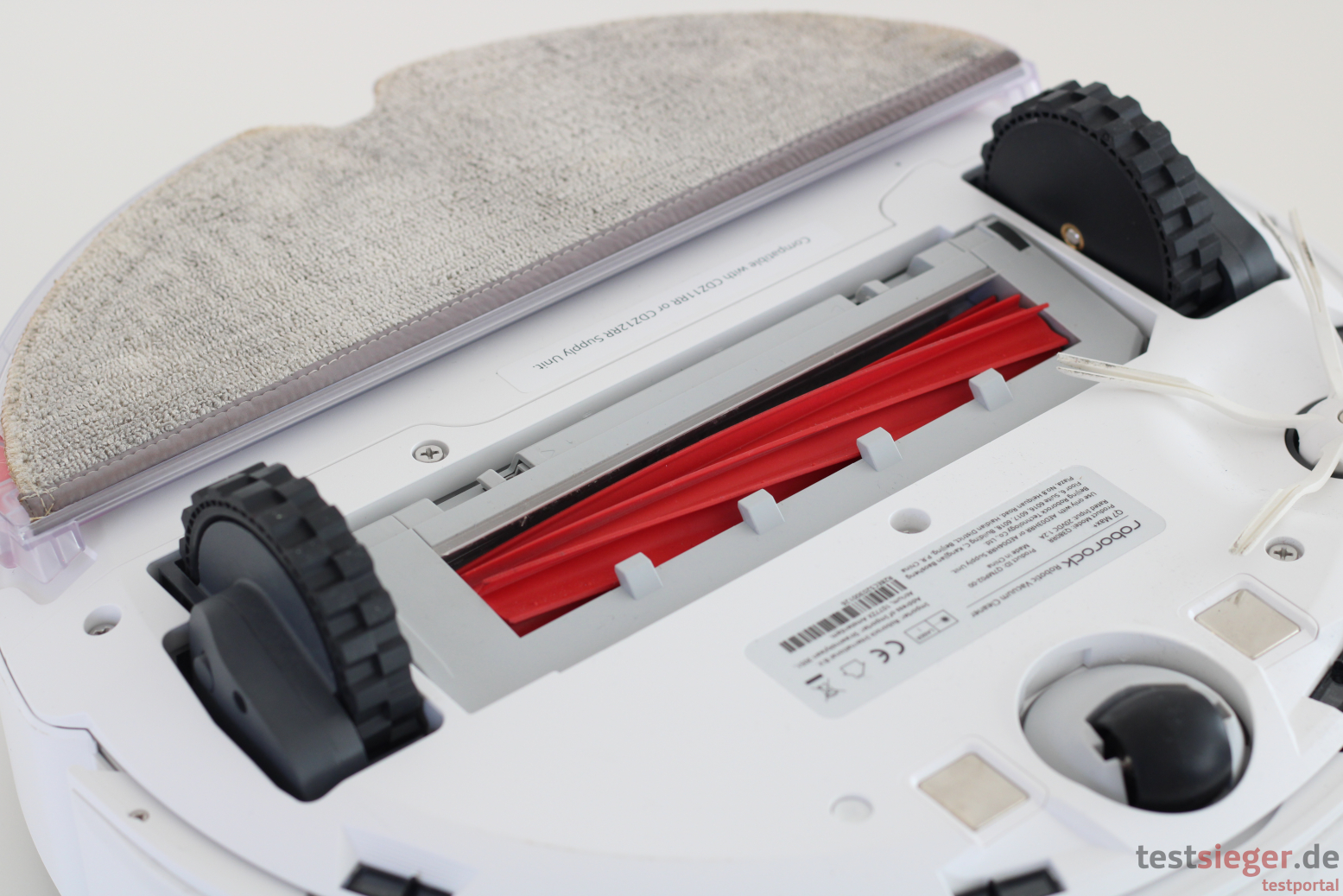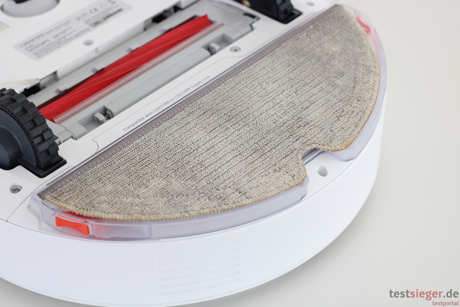 Es wirkt massiv und hält die Abdeckung stufenlos in Position. Die Staubbehälter-Wassertank-Kombi ist sauber in das restliche Gehäuse integriert und lässt sich einfach herausnehmen und wieder einsetzen. Wer den Roborock auch zum Wischen verwenden möchte, hängt die dünne Wischeinheit über ein gut sitzendes Klick-System auf der Unterseite ein. Der Wischer sitzt für eine bessere Flexibilität recht locker, das System hält aber fest am Gehäuse. Die Absaugstation punktet ebenfalls durch eine gute Verarbeitung. Die Motoreinheit wird über 6 Schrauben auf der Bodenplatte verankert und hält sicher. Das passende Werkzeug ist praktischerweise direkt auf der Unterseite angebracht.