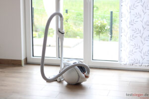 Die Düse gleitet über zwei Rollen angenehm über Hartböden. Bei Teppich saugt sie sich gerade auf den höheren Leistungsstufen etwas fest und es ist mehr Kraft nötig. Insgesamt funktioniert das Manövrieren aber auch hier noch ordentlich. Dank Gelenk drehen Nutzerinnen und Nutzer durch eine leichte Armbewegung um circa 90 Grad nach links und rechts. Teilweise verliert der Sauger dabei Bodenkontakt, was in der Praxis aber nicht schlimm ist.