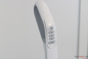 Die Bedienung erfolgt über eine kleine Fernbedienung, die sich im Betrieb in das Handstück einstecken lässt. Vor der ersten Verwendung müssen wir die Bedieneinheit einmal mit dem Sauger verbinden, was aber keine Probleme bereitet. Zunächst den X-Ô über die Powertaste am Korpus einschalten und die Remote über eine Tastenkombination in den Pairing-Modus versetzen. Jeder der vier Leistungsstufen spendiert Rowenta eine eigene Taste. Nutzerinnen und Nutzer müssen also nicht zwischen den Modi Eco, High, Max und Boost durchschalten. Die Boost-Taste müssen wir jedoch dauerhalft halten, bei den restlichen Leistungsstufen genügt ein Druck. Da der Schalter ergonomisch sinnvoll gestaltet und am Handstück platziert ist, bereitet uns die Bedienung in der Praxis keine Probleme. Zudem reagieren die Tasten zügig und setzen unsere Befehle souverän in die Tat um. Die Power-Taste am Korpus muss zwingend mit dem Finger bedient werden, ein Trittschalter wie bei klassischen Bodenstaubsaugern wäre aus unserer Sicht etwas komfortabler. Ebenfalls am Korpus befinden sich drei LEDs, welche die aktuell gewählte Leistungsstufe anzeigen. Ein Display ist allerdings nicht vorhanden.