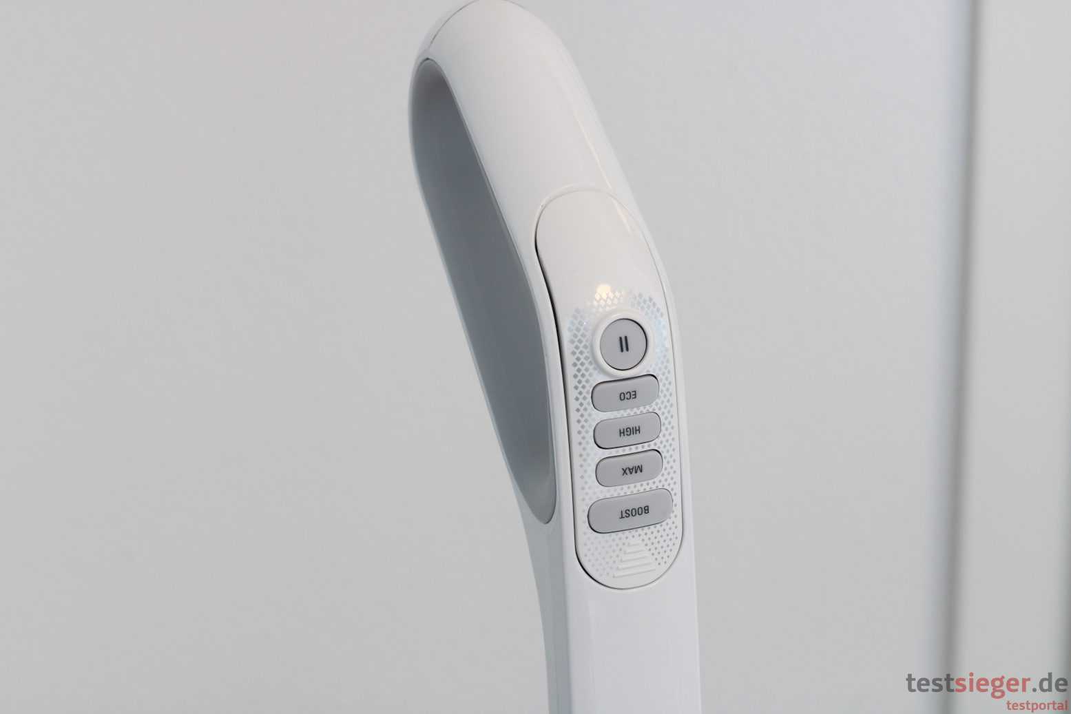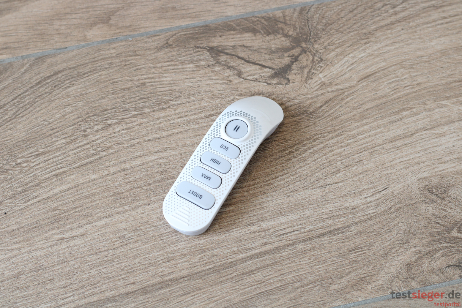 Die Bedienung erfolgt über eine kleine Fernbedienung, die sich im Betrieb in das Handstück einstecken lässt. Vor der ersten Verwendung müssen wir die Bedieneinheit einmal mit dem Sauger verbinden, was aber keine Probleme bereitet. Zunächst den X-Ô über die Powertaste am Korpus einschalten und die Remote über eine Tastenkombination in den Pairing-Modus versetzen. Jeder der vier Leistungsstufen spendiert Rowenta eine eigene Taste. Nutzerinnen und Nutzer müssen also nicht zwischen den Modi Eco, High, Max und Boost durchschalten. Die Boost-Taste müssen wir jedoch dauerhalft halten, bei den restlichen Leistungsstufen genügt ein Druck. Da der Schalter ergonomisch sinnvoll gestaltet und am Handstück platziert ist, bereitet uns die Bedienung in der Praxis keine Probleme. Zudem reagieren die Tasten zügig und setzen unsere Befehle souverän in die Tat um. Die Power-Taste am Korpus muss zwingend mit dem Finger bedient werden, ein Trittschalter wie bei klassischen Bodenstaubsaugern wäre aus unserer Sicht etwas komfortabler. Ebenfalls am Korpus befinden sich drei LEDs, welche die aktuell gewählte Leistungsstufe anzeigen. Ein Display ist allerdings nicht vorhanden.