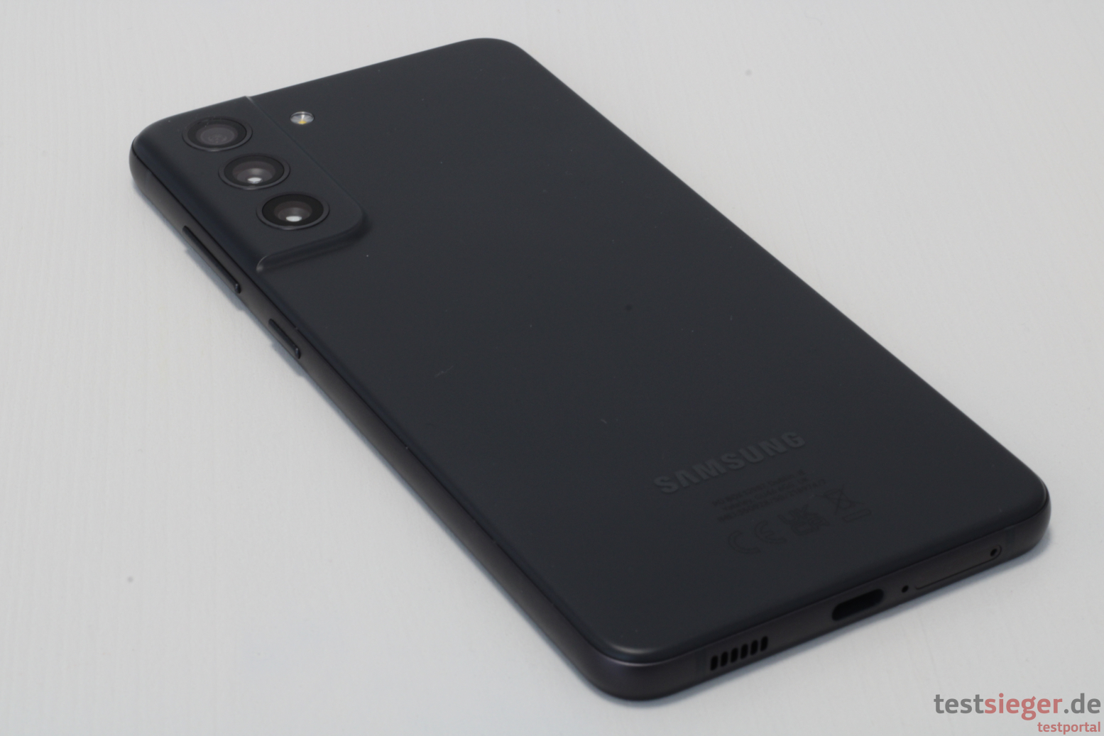 Die Verarbeitungsqualität ist auf einem hohen Niveau. Einziger Wermutstropfen: Die Rückseite besteht aus Kunststoff und fühlt sich dementsprechend nicht sonderlich wertig an. Der Rahmen besteht aus Aluminium und fasst Front und Hinterseite sauber ein. Wir entdecken keine auffälligen Spaltmaße. Trotz Kunststoff-Rückseite ist das Smartphone stabil und lässt sich selbst unter Druck nicht verbiegen. Nutzerinnen und Nutzer müssen also keine Angst haben, wenn sie es in der Hosentasche mitnehmen. Der Bildschirm ist durch Gorilla Glass Victus vor Kratzern geschützt. Allerdings hören wir bei unseren Belastungstests leise Knackgeräusche, die aus unserer Sicht jedoch zu vernachlässigen sind. Die IP68-Zertifizierung bescheinigt den Schutz vor Staub. Zudem soll das S21 FE bis zu 30 Minuten bis zu einer Tiefe von 1,5 Metern im Wasser überstehen.