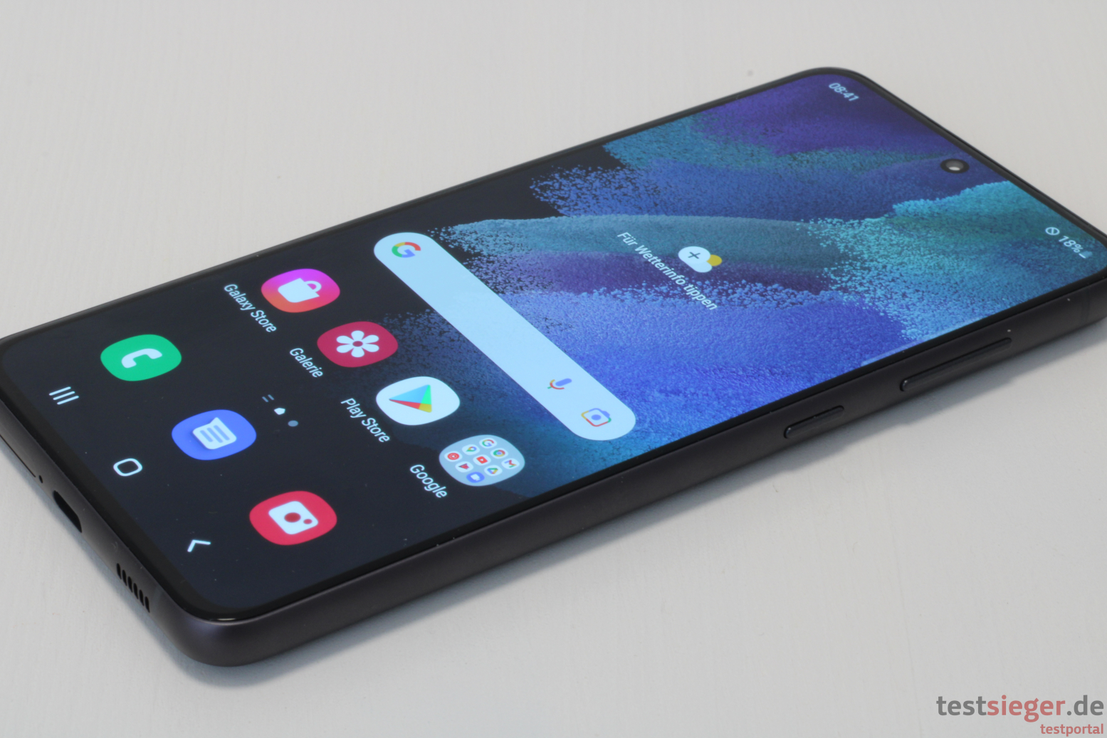 Das Display ist sicherlich eines der Highlights des Smartphones. Im Gegensatz zum herkömmlichen S21 wächst der Bildschirm auf 6,41 Zoll. In Kombination mit der Full-HD+-Auflösung von 2.400 x 1.080 Pixeln ergibt sich eine hohe Pixeldichte von 411 ppi. Nutzerinnen und Nutzer können sich also über eine scharfe Darstellung freuen. Aus normaler Entfernung entdecken wir nicht den Hauch einer Treppchenbildung. Aber selbst aus nächster Nähe lassen sich die einzelnen Bildpunkte maximal erahnen. Dementsprechend ist es für uns völlig in Ordnung, dass Samsung nicht in extrem hohe Auflösungssphären vordringt.
