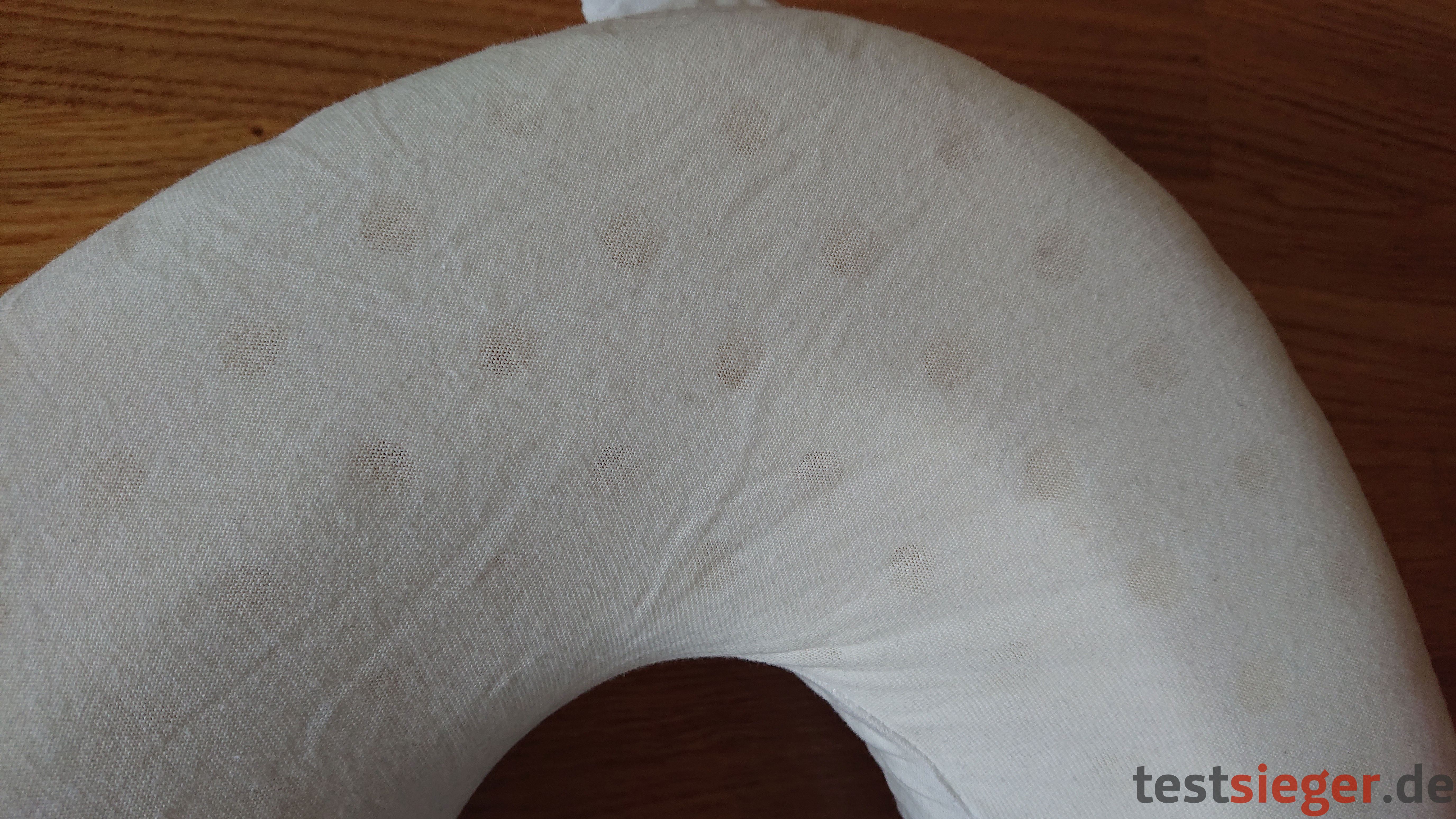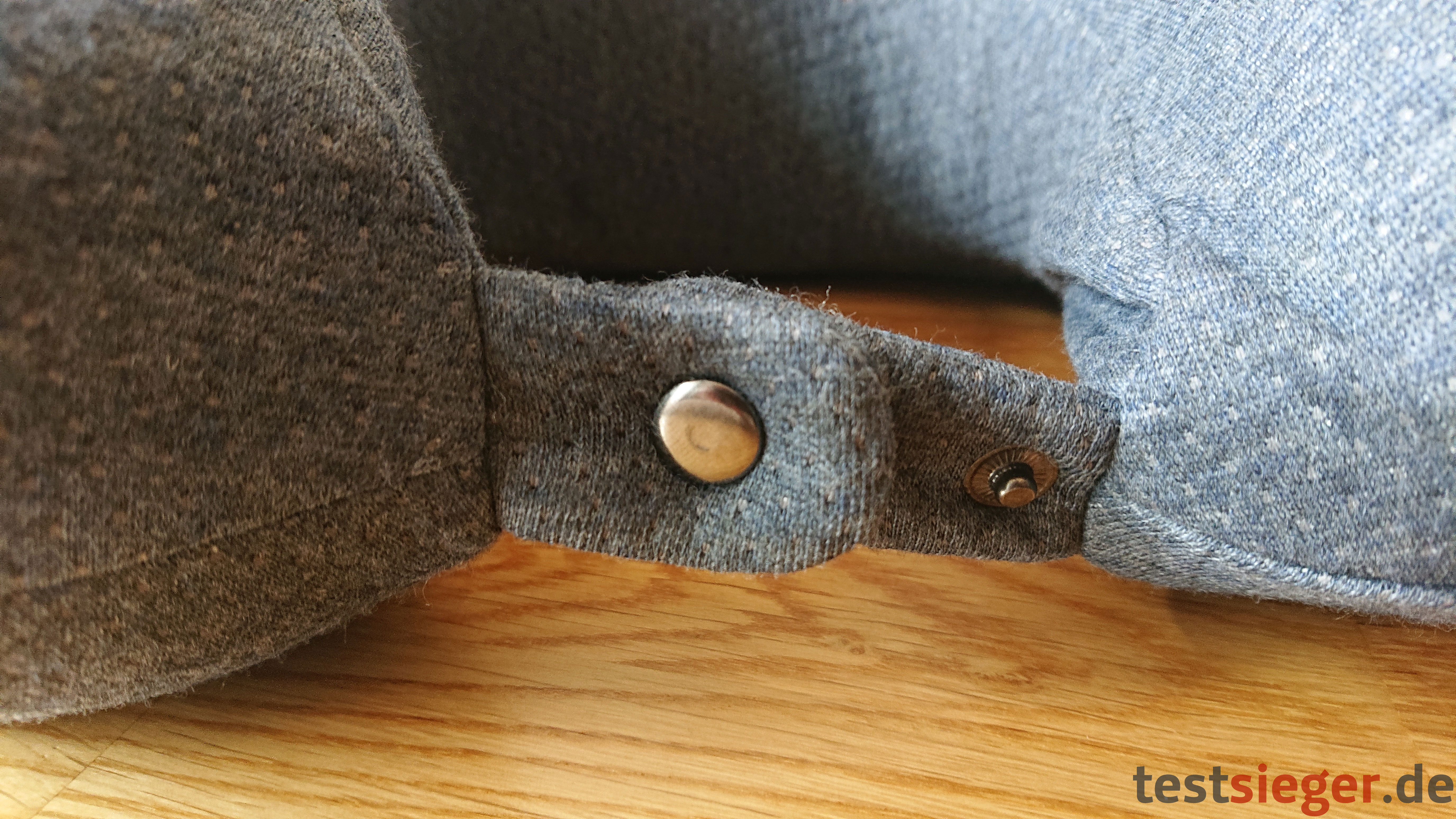 Sehr praktisch ist die ergonomische Form des Hörnchens: Auf der linken wie auch rechten Seite des Kissens sind Kulen, die sich der Kopfform der Nutzerinnen und Nutzer anpassen. Dadurch liegen der Kopf und der Nacken auf beiden Seiten komfortabel ab. Ein weiterer Komfortaspekt ist der verwendete viscoelastische Schaum. Der Kopf wie auch der Nacken werden aus unserer Sicht dadurch zusätzlich optimal gestützt und liegen weich ab. Da der Bezug atmungsaktiv ist und auch das innere Memory-Foam-Kissen sichtbare Belüftungskanäle aufweist, hatten wir nicht das Gefühl, dass der Kopf schwitzt oder uns zu kalt wird. Laut Hersteller tragen die Belüftungskanäle für eine zusätzliche Luftzirkulation bei.