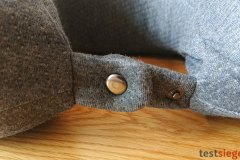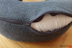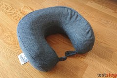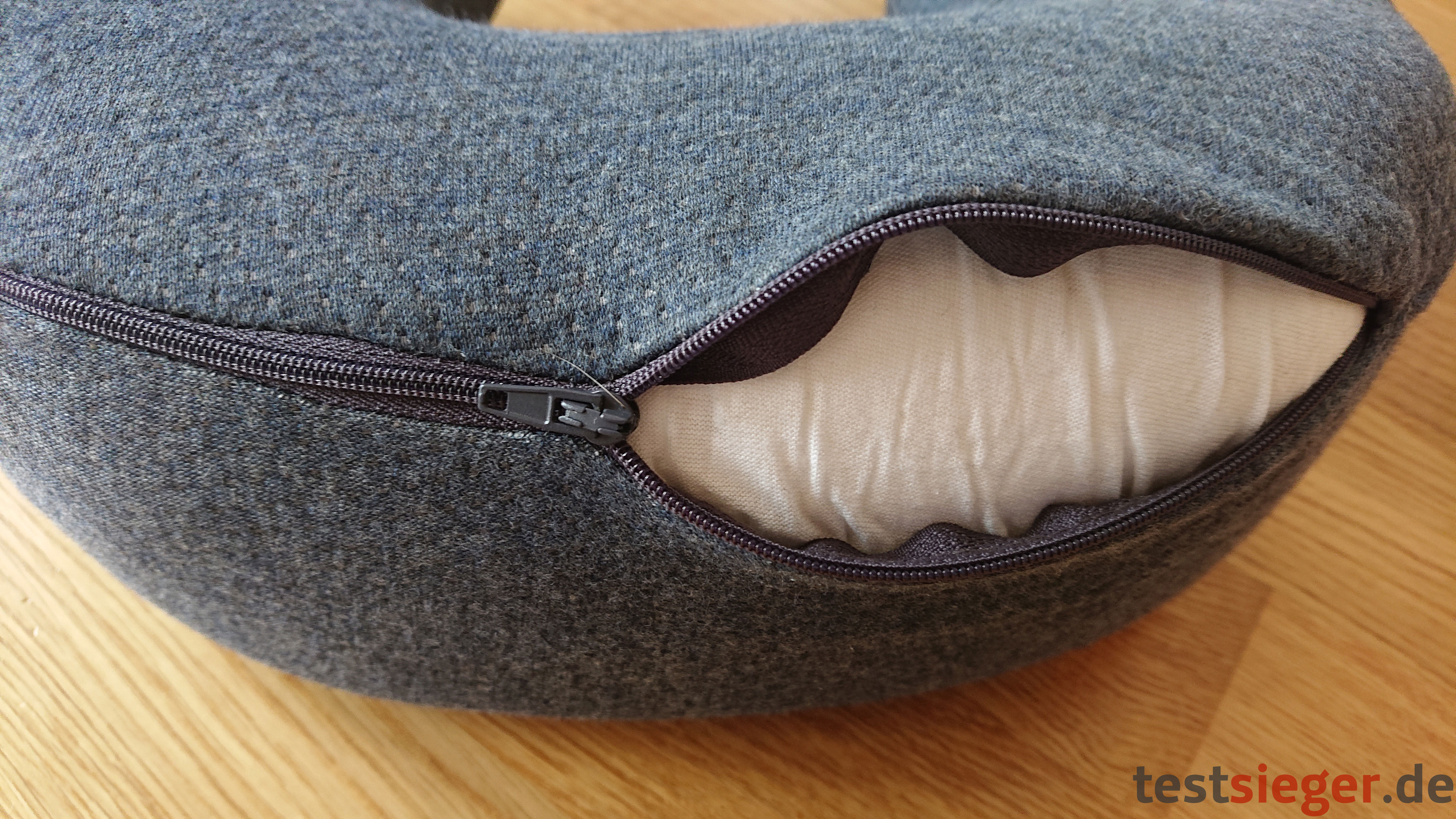 Durch das weiche Memory-Foam-Material lässt sich das Kissen auf Reisen einfach zusammenrollen und im beigelegten Reisebeutel verstauen – sehr praktisch. So bleibt es während dem Transport stets sauber. Im Test klappt das einrollen problemlos. Der Bezug kann bei 40 Grad in der Waschmaschine gereinigt werden. Allerdings könnte der Reißverschluss aus unserer Sicht gerne etwas länger sein. Wir müssen das Kissen ziemlich zusammenquetschen, um es wieder in den Bezug zu stecken.