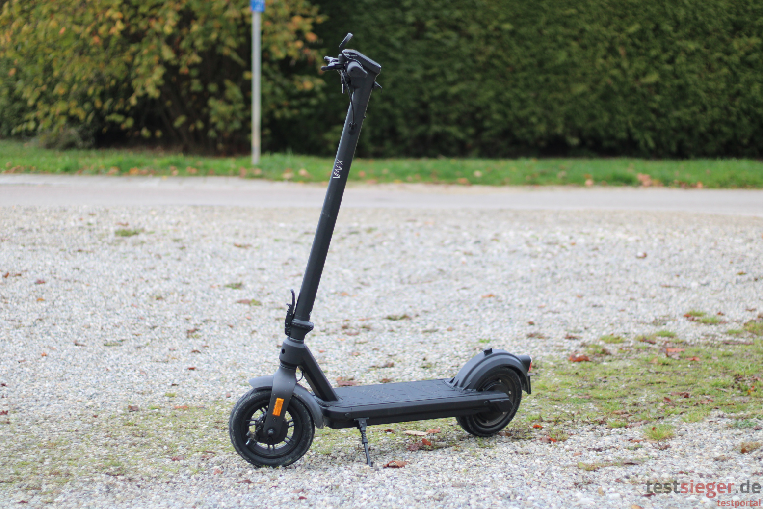 Die breiten Lufträder sind mit 10 Zoll recht groß, was einen guten Fahrkomfort verspricht. Front- und Rücklicht sowie Reflektoren an der Aufhängung der Vorderräder sorgen für eine bessere Sichtbarkeit. Eine Klingel zum Warnen anderer Verkehrsteilnehmer an der linken Seite des Lenkers ist ebenfalls vorhanden. Der Gas-Daumenhebel auf der rechten Seite der Lenkstange ist mit rutschfestem Gummi ummantelt und bietet so einen sicheren Halt. Auch die Knöpfe zum Ein- und Ausschalten des VX2 ST sowie der Lichtschalter sind hochwertig und haben einen guten Druckpunkt. Am Lenker befinden sich zudem rechts und links je ein Bremshebel, um den E-Scooter zu verlangsamen oder zum Stehen zu bringen.