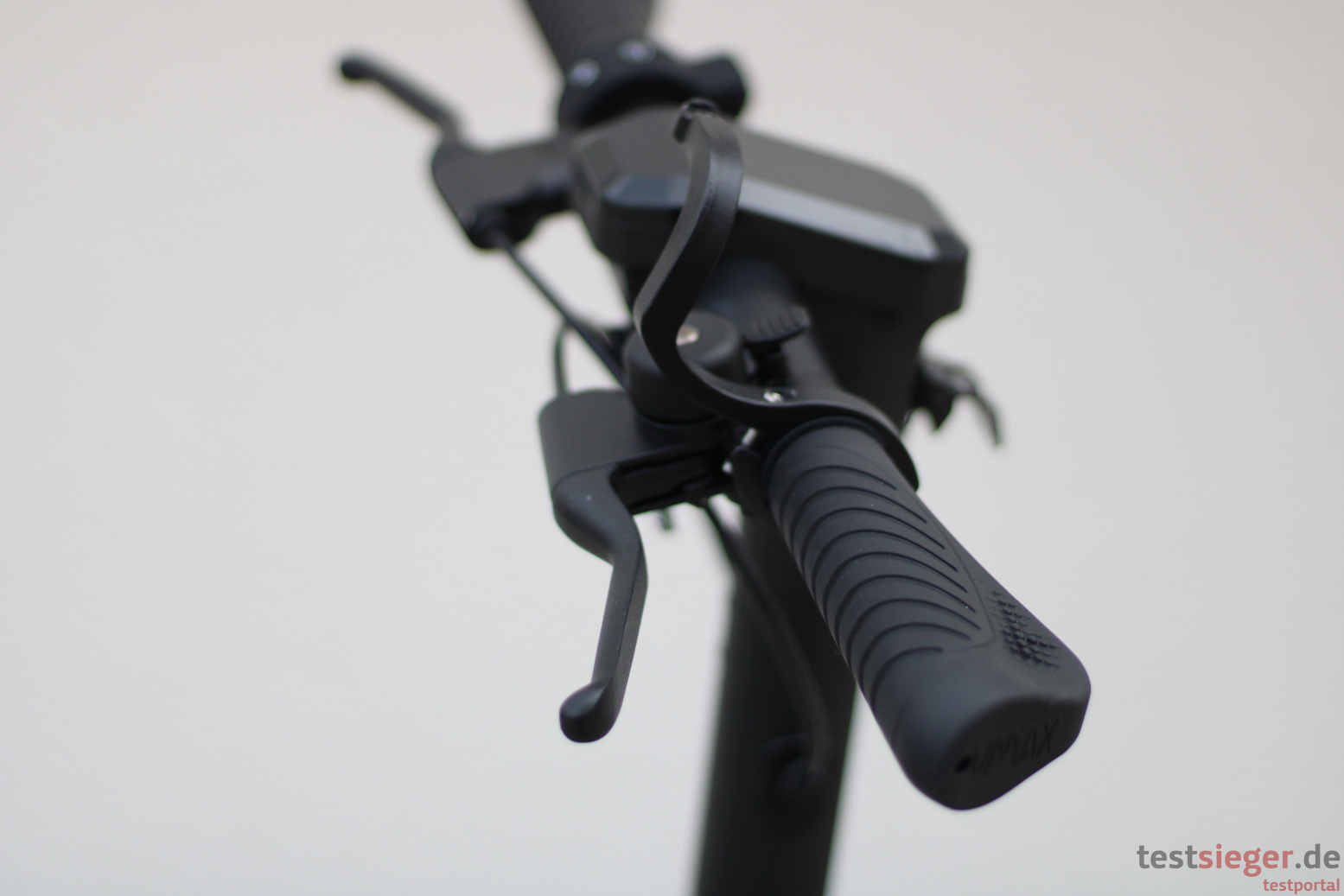 Zum Abbremsen haben Nutzerinnen und Nutzer gleich zwei Optionen: die mechanische Bremse am Vorderrad, deren Hebel sich links am Lenker befindet, oder eine elektrische Bremse am Hinterrad, die mit dem rechten Hebel aktiviert wird. Das Konzept überzeugt uns im E-Scooter-Test. Wir empfinden die elektrische Bremse als sanfter, sie eignet sich gut zum Reduzieren der Geschwindigkeit. Die mechanische Bremse hingegen bringt den E-Scooter schnell zum Stehen. Es empfiehlt sich daher, beide Bremsen kombiniert zu nutzen.