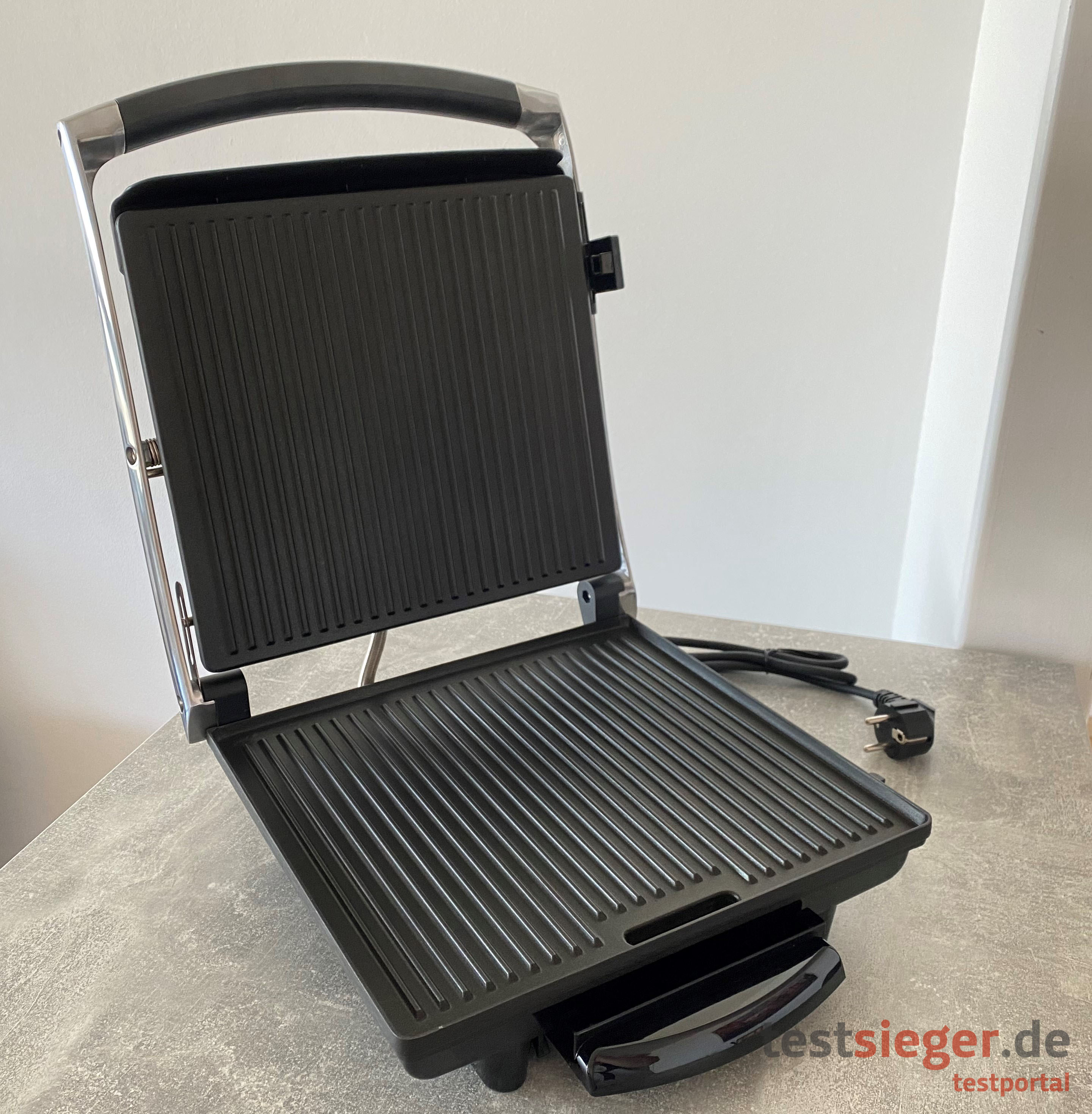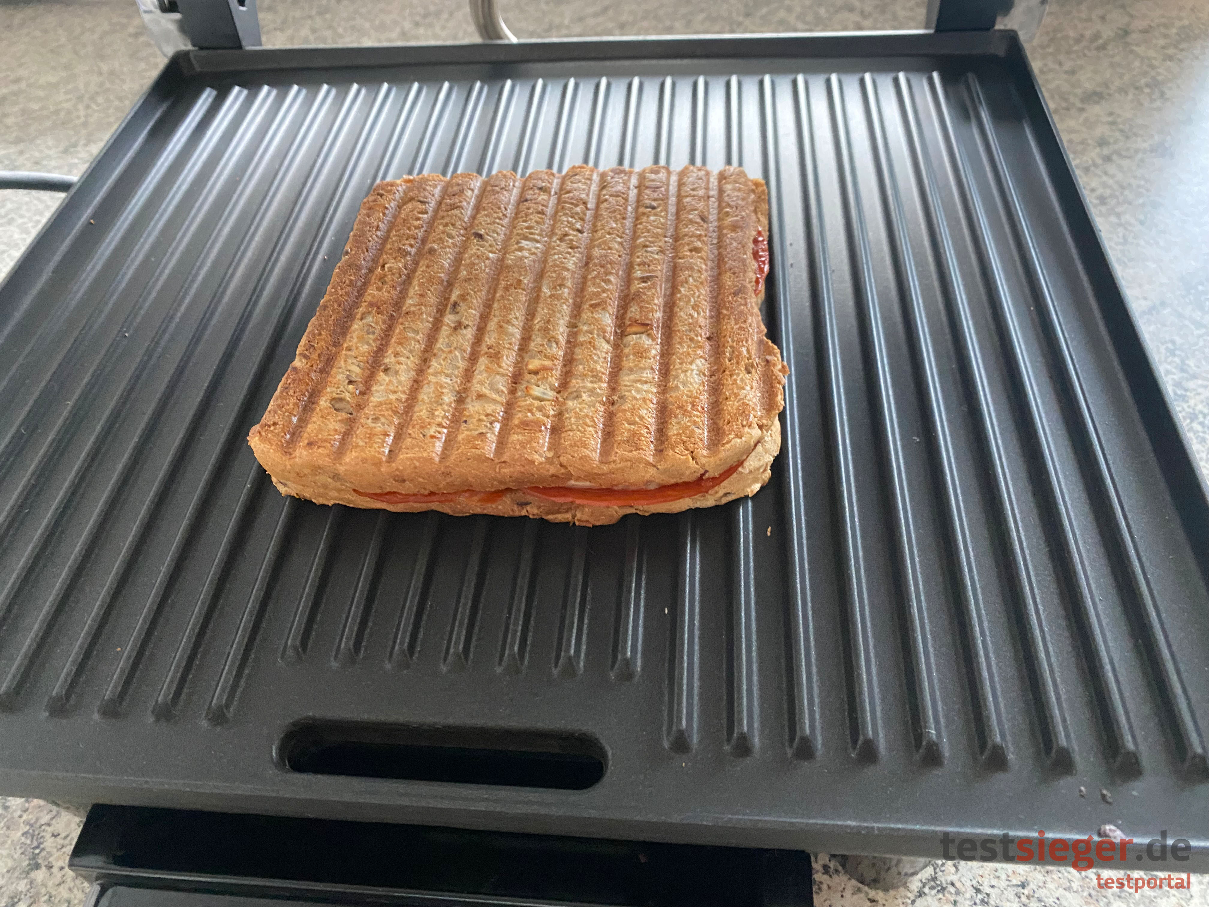 Positiv fällt uns der bewegliche Deckel auf. Verschiedenste Speisen bereitet unser Grill zu, ohne diese zu zerquetschen. In unserem Test funktionieren Sandwiches, Panini Fleisch, Fisch und Gemüse einwandfrei. Manchmal läuft bei Sandwiches der Käse heraus, jedoch bleibt dank der Antihaftbeschichtung nichts kleben. Ein mitgelieferter Spachtel hilft eventuelle Klebereste zu entfernen.