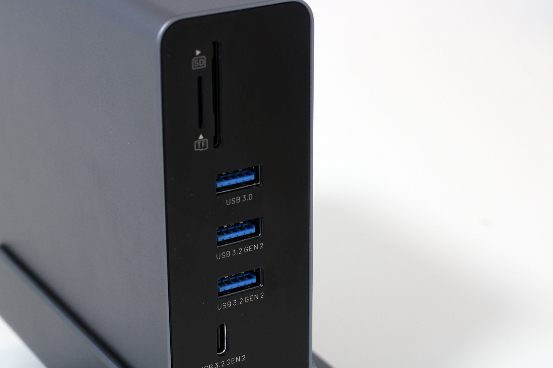 Die Dockingstation ist ein echtes Anschlusswunder und dürfte so gut wie alle Bedürfnisse abdecken. Die Schnittstellen verteilen sich auf die Vorder- und Rückseite je nach Sinnhaftigkeit. So befinden sich beispielsweise die Displayausgänge auf der Hinterseite. Es gibt insgesamt 5 USB-A-Anschlüsse. 2 liegen in der Version 3.2 vor, mit sehr schnellen Datenübertragungsgeschwindigkeiten von bis zu 10 Gigabit pro Sekunde (Gbps). Der USB-3.0-Anschluss bietet immerhin noch 5 Gigabit pro Sekunde (Gbps). Die beiden ältere USB 2.0-Anschlüsse auf der Rückseite sind deutlich langsamer (480 Megabit pro Sekunde), eignen sich aber immer noch gut für einfache Geräte wie Maus oder Tastatur. Zusätzlich verfügt die Station über 2 USB-C-Anschlüsse (USB 3.2), von denen einer ebenfalls bis zu 10 Gbps erreicht und der andere 5.
