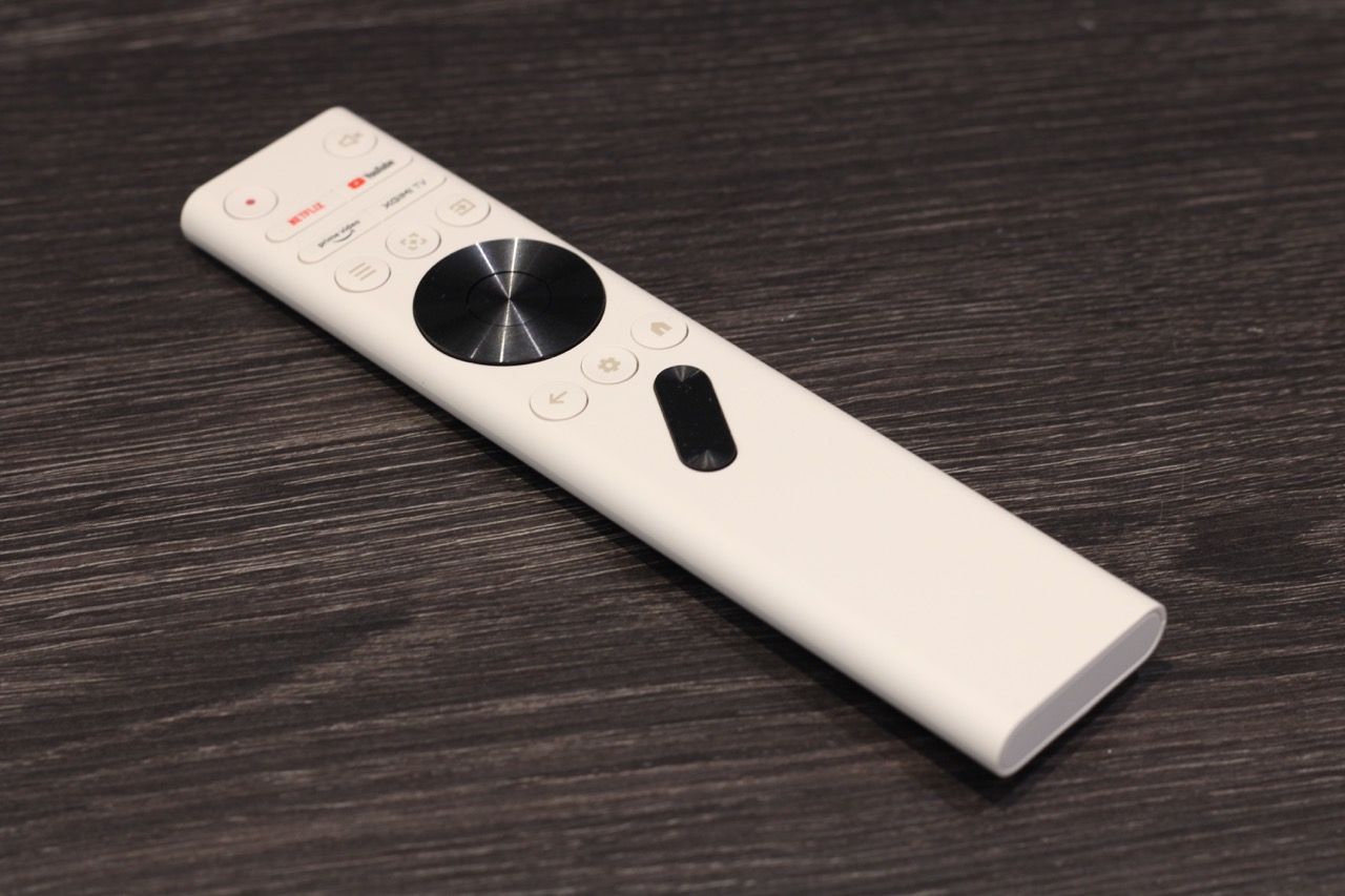 Die Fernbedienung des XGIMI Elfin Flip ist kompakt und gut durchdacht. Alle wichtigen Tasten, wie die Quellenwahl oder Direkttasten für Netflix und Amazon Prime Video, sind vorhanden und sinnvoll angeordnet. Die Tasten reagieren präzise auf Eingaben, wodurch die Steuerung angenehm unkompliziert bleibt. Einziger Kritikpunkt ist die etwas überdimensionierte Länge der Fernbedienung.