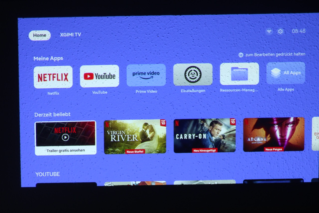 Der Elfin Flip läuft mit dem hauseigenen Betriebssystem XGIMI OS, das durch eine übersichtliche und intuitive Gestaltung punktet. Menüs lassen sich schnell navigieren, Eingaben werden flüssig umgesetzt. Allerdings gibt es einen deutlichen Nachteil: Die Auswahl an Apps ist stark eingeschränkt. Während Netflix, YouTube und Amazon Prime Video zur Verfügung stehen, fehlen viele andere bekannte Streaming-Dienste. Stattdessen sind vor allem weniger bekannte Apps im Store zu finden.