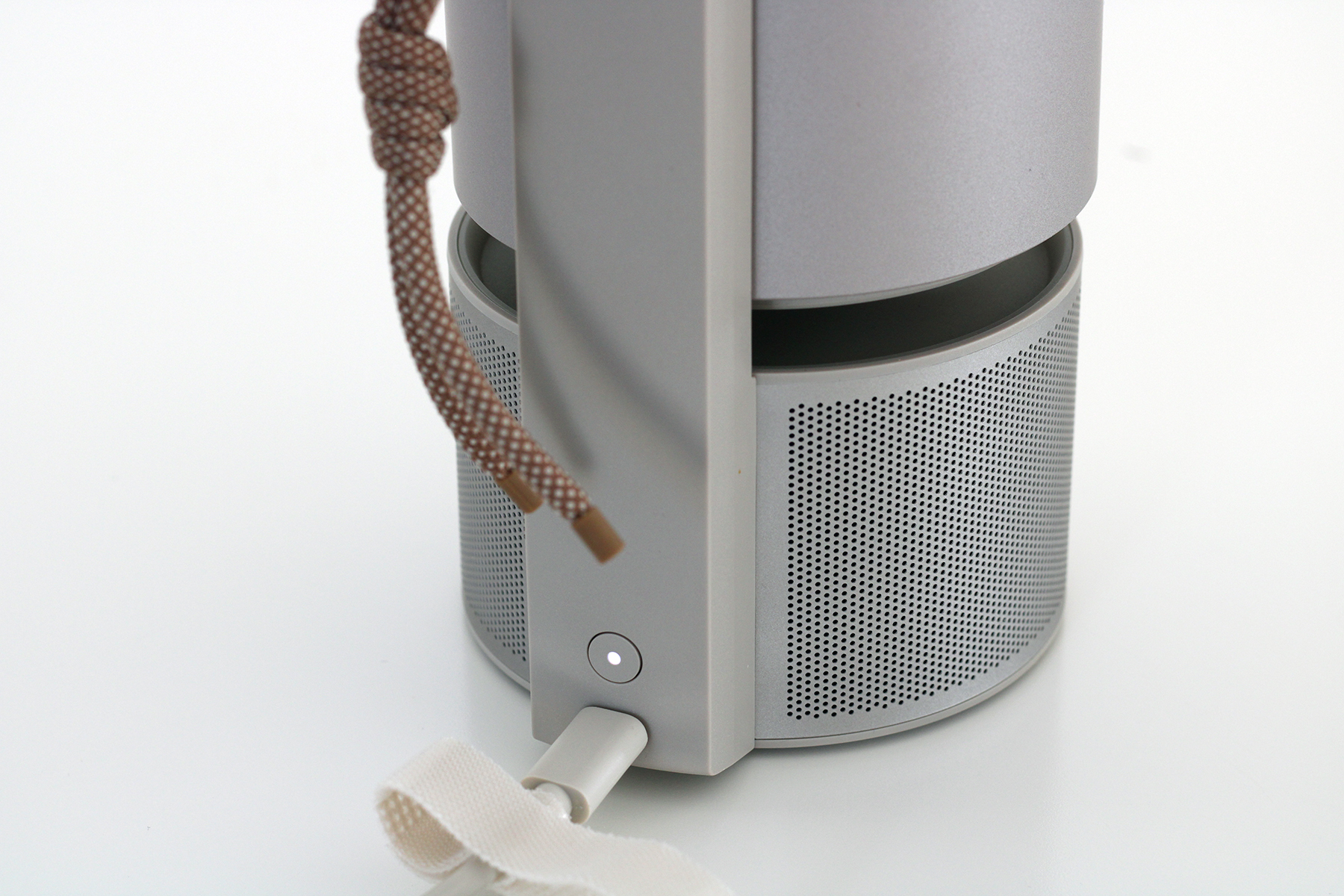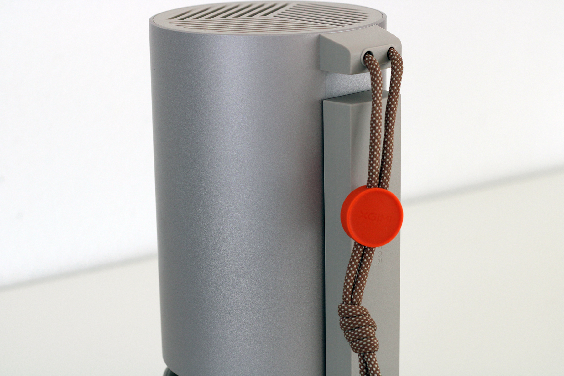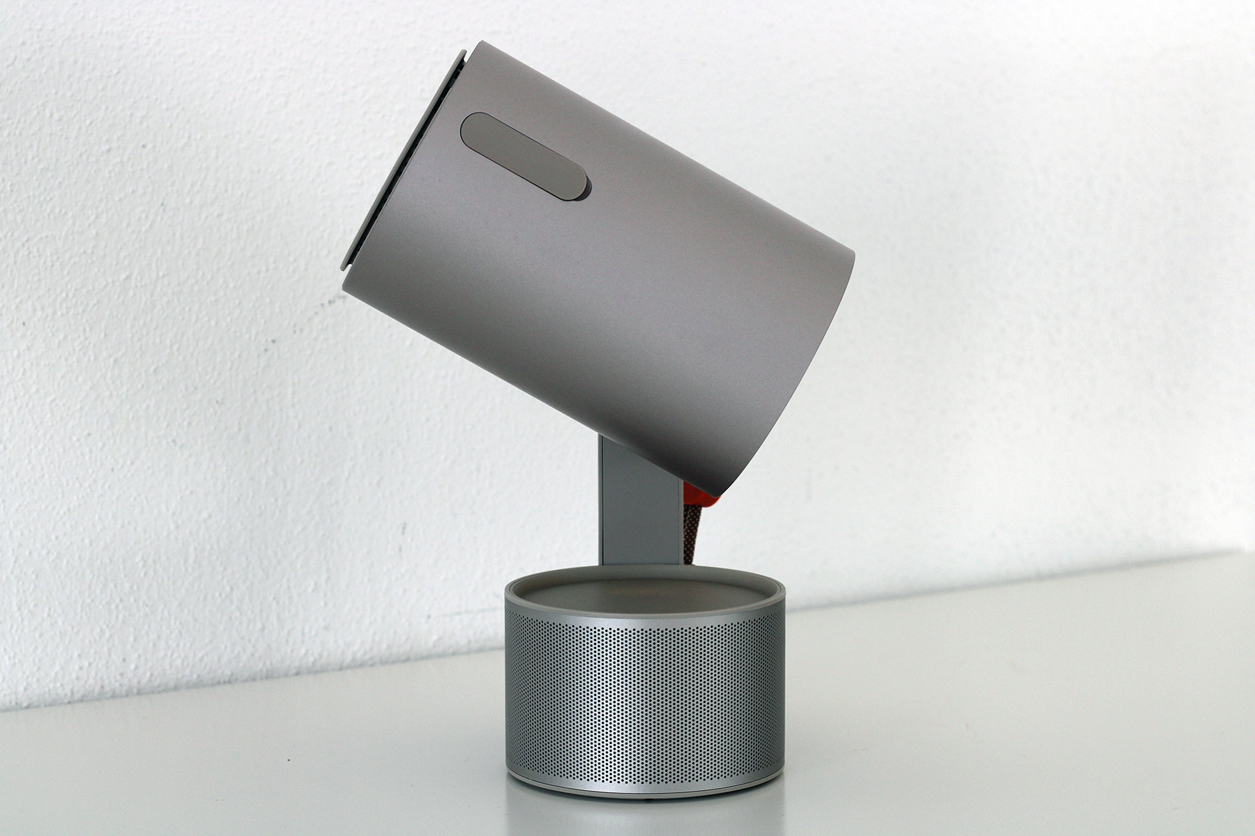 Der Projektor lässt sich am eingebauten Ständer um bis zu 130 Grad drehen, was eine hervorragende Flexibilität zur Folge hat. Zudem hat sich XGIMI noch ein besonderes Design-Element überlegt. Wenn wir den Projektor am Ständer nach oben bewegen, rastet er ein und „schwebt“ circa einen Zentimeter über der Basis, die auch den integrierten Lautsprecher beherbergt. Zusätzlich schaltet der Projektor eine Stimmungs-LED ein, die auf Wunsch zur Musik pulsiert. In dieser Position lässt sich der Beamer auch als stylisher Bluetooth-Lautsprecher verwenden.