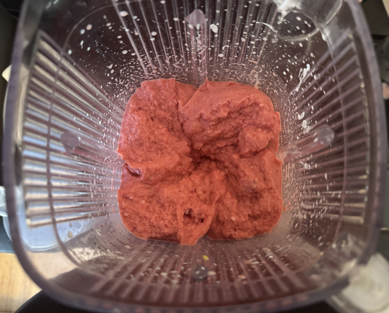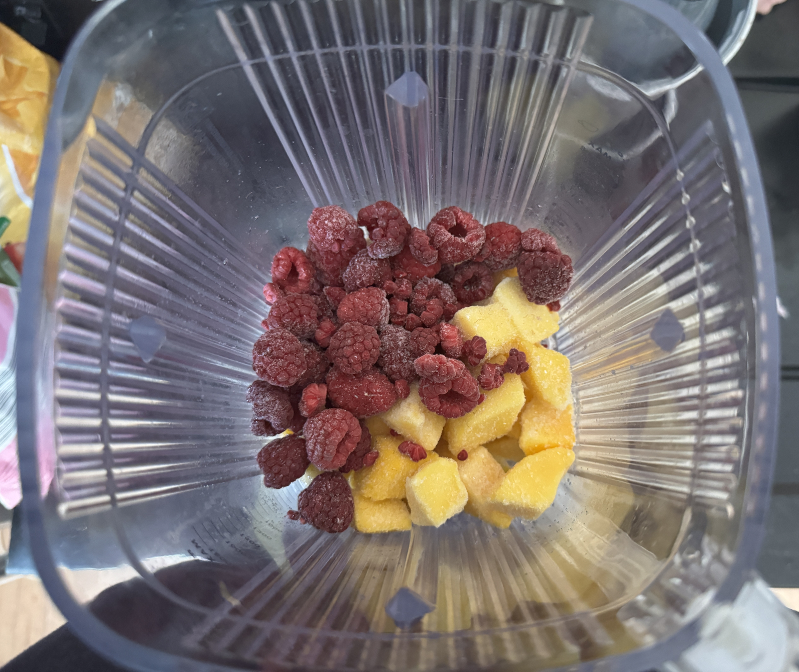 Herausfordernder ist die Herstellung von Eiscreme. Hier verwenden wir gefrorenen Früchte (Mango und Himbeeren) mit Joghurt und ein wenig Flüssigkeit. Ohne eine genaue Mengenangabe für Flüssigkeit in der Gebrauchsanweisung gestaltet sich die Zubereitung schwierig, da die gefrorenen Früchte nur hochgeschleudert werden und sich die Masse nicht wie gewünscht vermischt. Mit der Zugabe von mehr Flüssigkeit können wir das Problem zwar lösen, jedoch führt dies eher zu einer dickflüssigen Smoothie-Konsistenz als zu Eis.