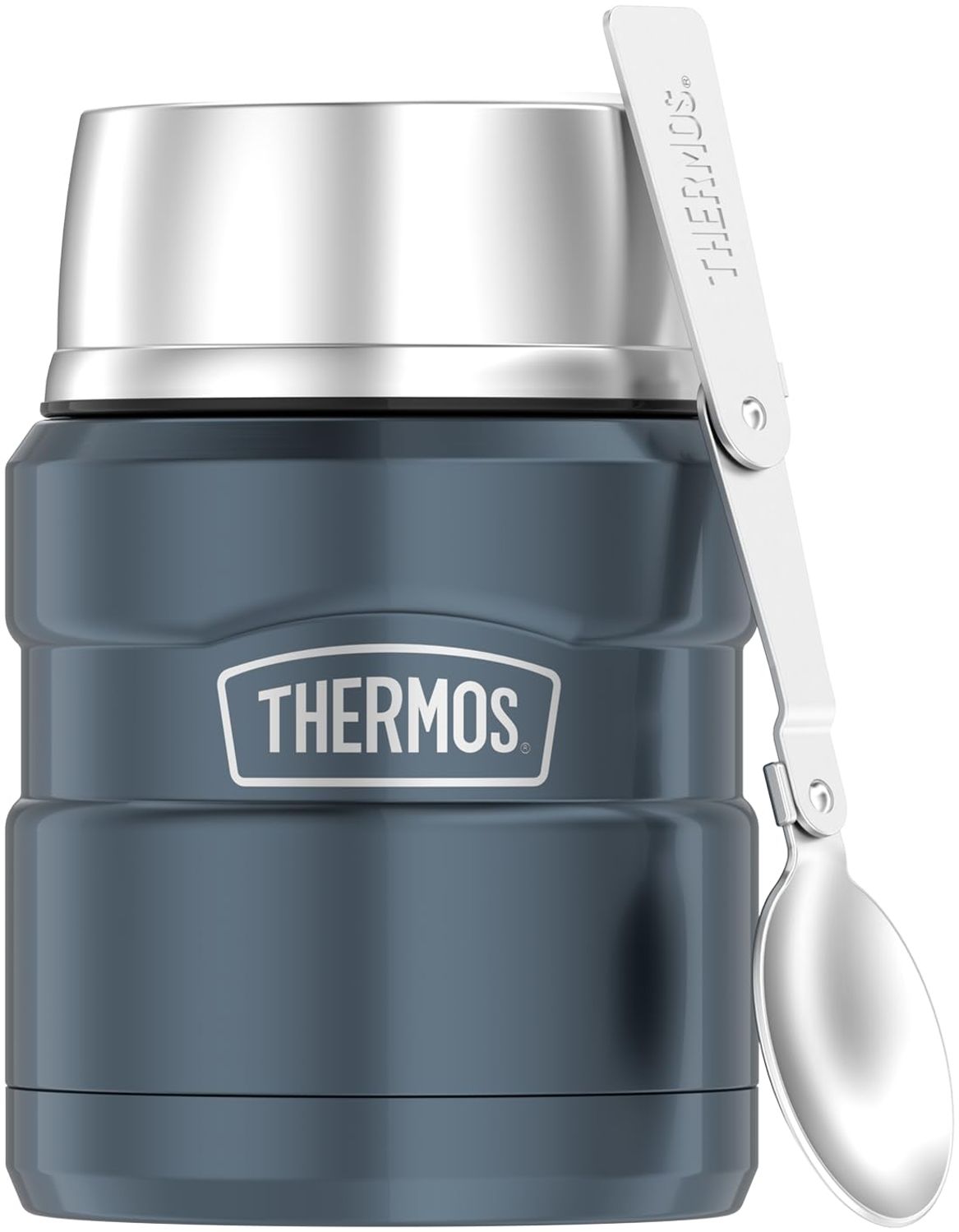 Der THERMOS STAINLESS KING Thermobehälter für Essen in ice grey bietet mit einem Fassungsvermögen von 0,47 l eine zuverlässige Isolierleistung. Speisen bleiben bis zu 9 Stunden heiß und bis zu 14 Stunden kalt. Der klappbare Edelstahl-Löffel ist im Deckel integriert und sorgt für praktischen Komfort. Hergestellt aus robustem 18/8 Edelstahl, ist der Behälter absolut dicht und spülmaschinenfest bis 65 °C. **Highlights** - doppelwandiger Edelstahl mit 0,47 l Fassungsvermögen - einfaches Handling mit Drehverschluss und faltbarem Edelstahl-Löffel - absolut dicht und damit auslaufsicher - unverfälschter Geschmack ohne Innenbeschichtung - schlag- und bruchfester Edelstahl trotzt jeder Situation **Produkteigenschaften** - Maße (HxØ): 14,5x9,5 cm - Gewicht: 365 g - Öffnungsdurchmesser: 6,0 cm - Isolierung gibt Temperatur nicht nach außen, sicher von außen anfassen - isolierter Druckentlastungsverschluss - spülmaschinenfest bis 65 °C **Lieferumfang** - 1x THERMOS STAINLESS KING Thermobehälter für Essen - 1x klappbarer Edelstahl-Löffel - ohne Innenbeschichtung