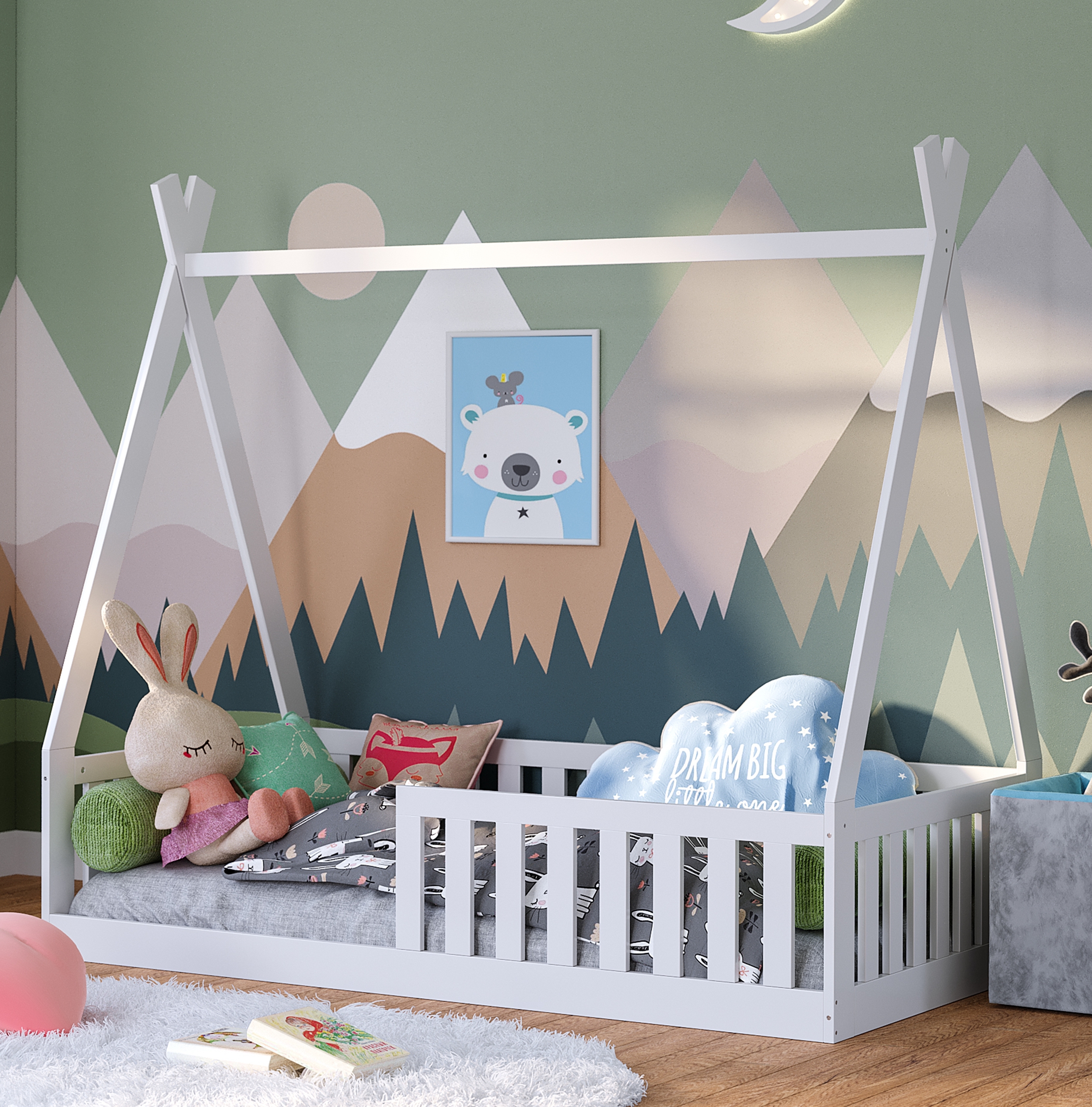 Das Tipi Bett 'Tajo' von Bellabino ist eine funktionale und optisch ansprechende Schlaflösung für das Kinderzimmer, die die spielerische Fantasie der Kleinen fördert und und für erholsame Nächte sorgt. Das Kinderbett von Bellabino wird direkt auf dem Boden platziert. Dank der niedrigen Betthöhe genießt Ihr Kind den direkten Zugang zum Schlafplatz und braucht beim Ein- und Aussteigen nicht mehr die Hilfe von Mama und Papa. Die geräumige Liegefläche in 80x160 cm mit eingebautem Rolllattenrost sorgt zudem für einen gemütlichen Schlafbereich und lässt sich zugleich auch in kleinen Schlafräumen problemlos integrieren. Aus massiver Kiefer gefertigt, die der Konstruktion eine hohe Robustheit schenkt, überzeugt 'Tajo' weiterhin durch sein ausgefallenes Tipi-Design in der Farbe Weiß, das dem Kinderzimmer ein optisches Highlight schenkt. Ob mit Betthimmel, Lichterkette oder Lampions: Die Bettpfosten lassen sich beliebig dekorieren und verwandeln. 'Tajo' in eine unvergleichliche Spieloase, die Ihrem Liebling viele, lustige Stunden bereitet! **Produktdetails:** - Maße: Höhe 143 cm, B 164 cm, T 84,5 cm - Liegefläche: 80x160 cm - Material: Massivholz, Kiefer und MDF - Farbe: Weiß - Max. Belastbarkeit: 100 kg - Lieferumfang: Tipi-Bodenbett inkl. Rausfallschutz und Rolllattenrost - Einfach und schnell montierbar