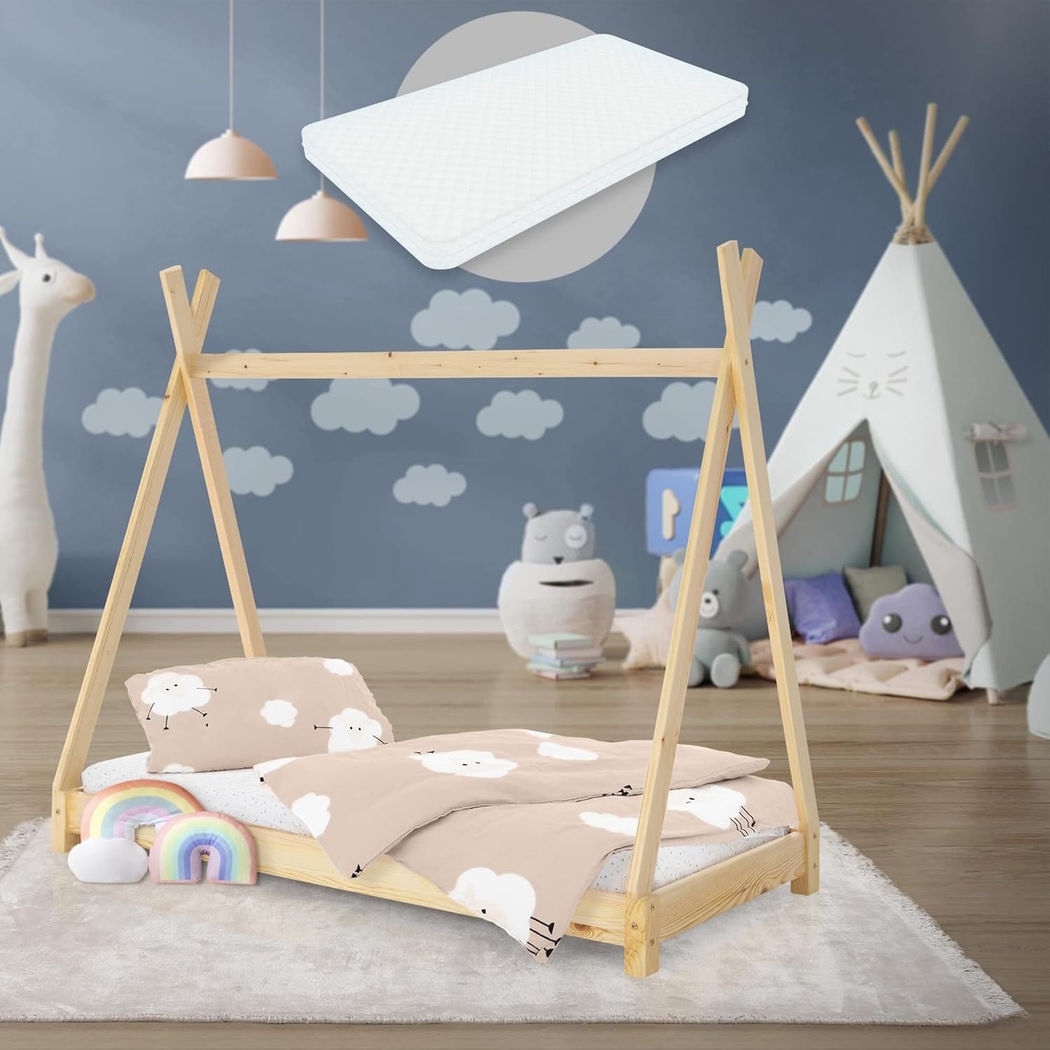 **Produktbeschreibung:** Die schönen Kinderbetten von ML-Design sind nicht nur der angenehme Schlafplatz deines Kindes, sondern auch robust genug um darauf zu spielen. Das Bett ist für Kinder im Alter von 2-6 Jahren geeignet. Auf dem Bett zu springen, zu toben und zu spielen stellt kein Problem dar. Die vertikalen Streben sorgen für eine spielerische Optik, dies es auch ermöglicht Decken oder andere Stoffverzierungen anzubringen. Das eigene Fort bzw. die eigene Höhle lassen sich ganz einfach mit dem Kinderbett bauen. Das stabile Kieferholz und die gute Herstellung sorgen für eine lange Lebensdauer des Kinderbettes. Diese Kindermatratze lässt deinen Kindern den wohlverdienten Erholungsschlaf bekommen, den sie brauchen. Die Kaltschaummatratze bietet eine gesunde Unterstützung für Kopf, Nacken, Rücken und Beine. Der Matratzenkern ist aus hochwertigem, hypoallergenem Kaltschaum und ist somit bestens geeignet für Allergiker. Sollten Verunreinigungen auf der Matratze geschehen, kannst du den Steppbezug mithilfe des Reißverschlusses einfach abnehmen und in die Waschmaschine geben. Der Bezug der Kinderschaumstoffmatratze ist abnehmbar und waschbar. Mittels eines Reißverschlusses an einer der beiden Kurzseiten kann der Bezug geöffnet und problemlos abgezogen werden. Der Bezugsstoff besteht zu 100 % aus Polyester. Die hochwertige Komfortschaummatratze ist gleichermaßen für Baby- und Kinderbetten mit den Maßen 70 x 140 cm geeignet. Beide Liegeseiten sind mit der gleichen Stützkraft ausgestattet, so ist die Matratze beliebig drehbar und wendbar. Diese Kindermatratze wurde mit dem Standard 100 ausgezeichnet. Das heißt die Matratze besteht aus Materialien und ist somit zu 100% . **Eigenschaften:** **Kinderbett** Stabile Bauweise Inklusive Lattenrost Kinderbett in Tipi-Optik Hochwertiges Kieferholz Für Kinder im Alter 2-6 Jahren Kinderbett mit vertikalen Streben Hochwertige Qualität von ML-Design Eye-Catcher fürs Kinderzimmer Spielen, schlafen und toben in einem Perfekt um das eigene Fort zu errichten **Kindermatratze** Kindermatratze 140 x 70 x 10 cm mit abnehmbarem Bezug Für Allergiker geeignet Perfekt für dein Kinderbett Hochwertiger Kaltschaum Gesunde Lage der Körperpartien Pflegeleichter Microfaserbezug, abnehmbar und waschbar Bezugsstoff nach 100-Standard Optimale Unterstützung unabhängig der Schlafposition Absteppen der Außenhülle erfolgt durch Ultraschallbonden ohne Fäden, um das Eindringen von Flüssigkeiten zu verzögern Weiches Material Atmungsaktiv Verschleißfest Gute Hautverträglichkeit Hohe Dicke Optimaler Komfort Passt optimal Perfekt für Babys- und Kleinkinder **Lieferumfang:** 1 x Kinderbett Tipi inkl. Lattenrost von ML-Design 1 x Kindermatratze **Technische Details:** **Kinderbett** Farbe: Natur Gewicht: ca. 11,5 kg Material: Kieferholz Maße (LxBxH):ca. 147,5 x 77,5 x 137 cm Maße Liegefläche (LxB): ca. 140 x 70 cm Materialstärke: ca. 9 / 6 x 2 cm **Kindermatratze** Material Bezug: 100% Polyester Material: Kaltschaum Maße (LxBxH): ca. 140 x 70 x 10 cm Dichte: 23 kg/m³ Härtegrad: 4,2 kPa Allergiker: geeignet Bezug abnehmbar: Ja Zertifizierung: Standard 100 Gewicht: ca. 3,1 kg