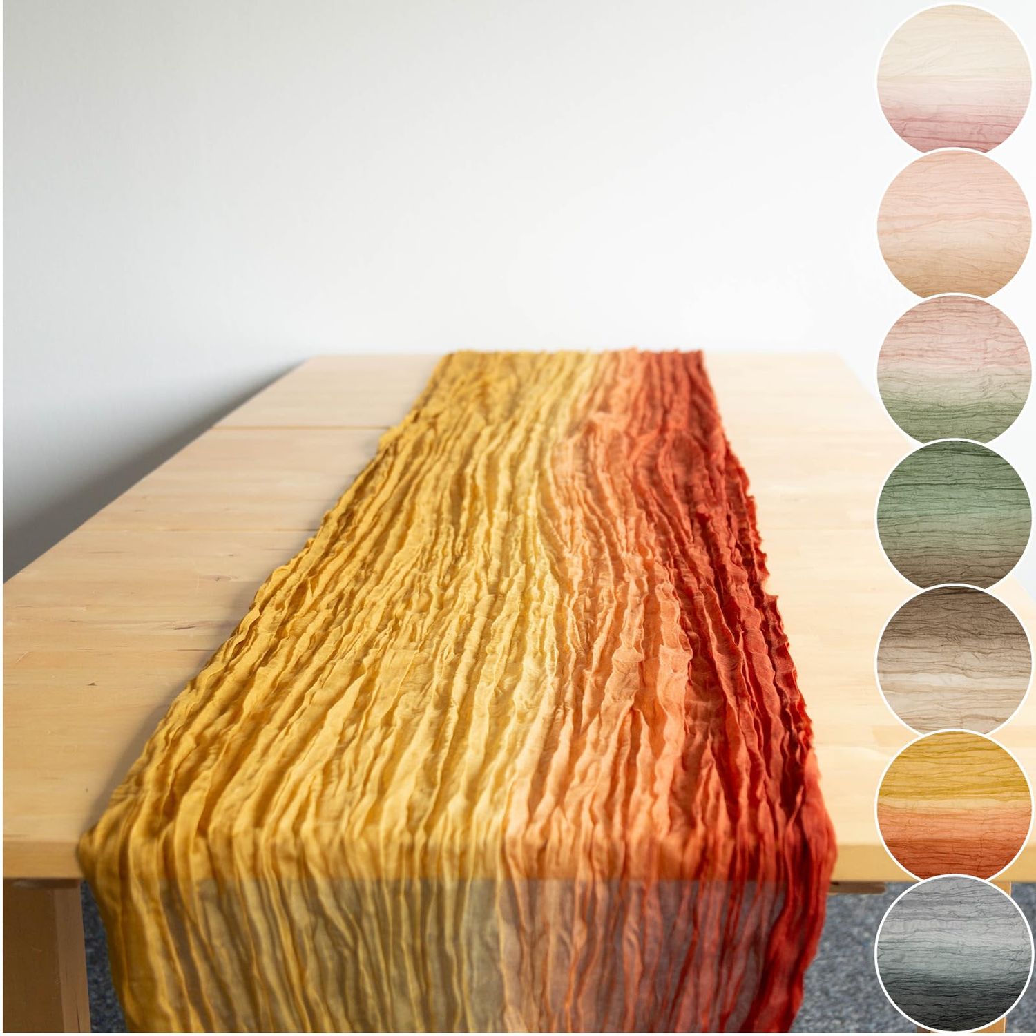 | Name | Halbach Seidenbänder Multicolor Tischläufer | Breite: 70 cm Länge: 300 cm | Tischtuch mit Farbverlauf, schmale Tischdecke in Baumwoll-Optik für Hochzeiten, Farbe: honiggelb/orange/dunkelorange |