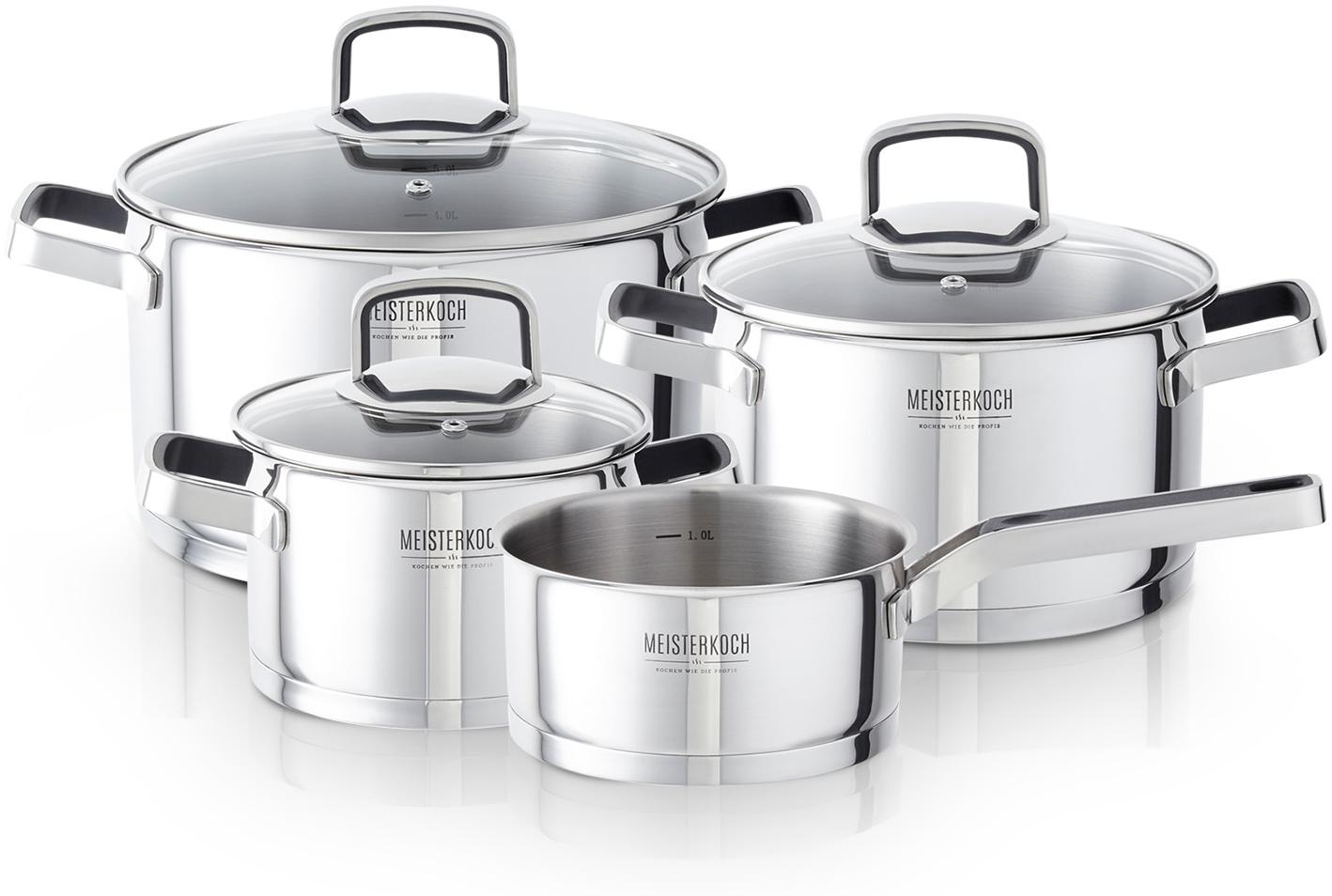 | Name | MEISTERKOCH Kochtopf Set komplett aus Edelstahl 4-teilig mit 16cm, 20cm, 24cm Ø Topf & 16cm Soßentopf mit Stiel, Glasdeckel mit Dampfloch, geeignet für Herdarten Induktion, Gas, Elektro & Glaskeramik |