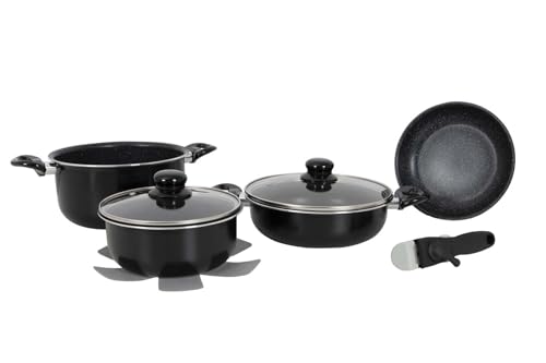 "Das Gimex Kochtopfset bietet mit drei Töpfen, einer Pfanne, zwei Deckeln und einem Griffe in umfangreiches Sortiment an Kochutensilien. Die Wärmeleitfähigkeit ist mäßig, die fest montierten Griffe an zwei Töpfen vergrößern das Packmaß deutlich."