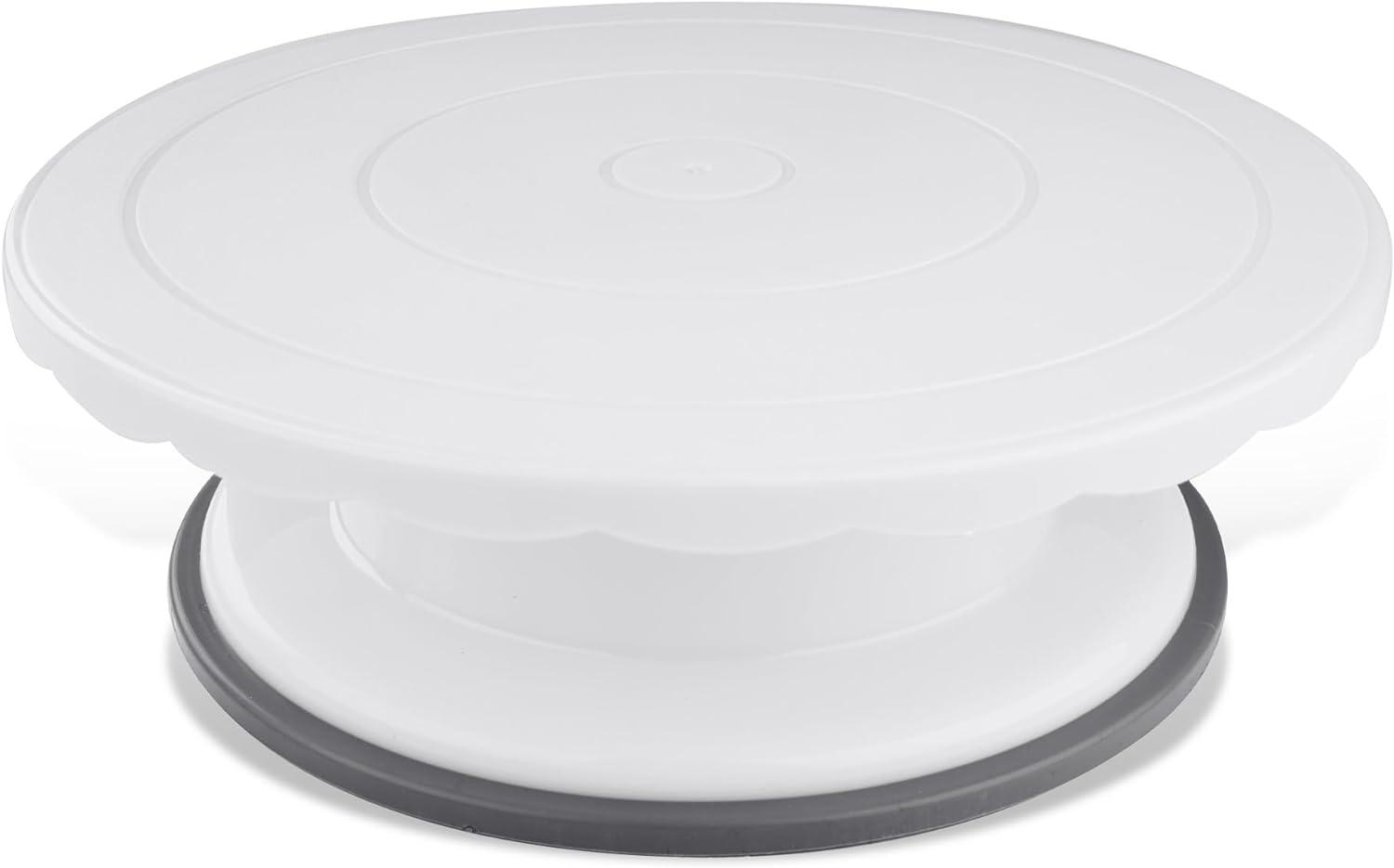 Die Dr. Oetker Drehbare Torten-Kuchen-Platte mit einem Durchmesser von 27,5 cm ist ideal zum mühelosen Einstreichen und Dekorieren von Torten und Kuchen. Dank der präzisen und leichten Drehbewegung nach rechts und links gelingt Ihnen das Arbeiten spielend einfach. Die raue Oberfläche sorgt für einen stabilen Stand, während der Anti-Rutsch-Fuß ein Verrutschen verhindert. Hergestellt aus robustem Kunststoff ABS und ausgestattet mit einem Silikonring am Fuß, ist die Reinigung unkompliziert, jedoch nicht spülmaschinengeeignet. **Highlights** - Perfekt zum Einstreichen und Dekorieren von Torten und Kuchen - Präzise und leichte Drehbewegung nach rechts und links - Raue Oberfläche für stabilen Stand des Kuchens - Anti-Rutsch-Fuß verhindert Verrutschen - Geeignet für alle gängigen Kuchengrößen bis Ø 27,5 cm **Produkteigenschaften** - Material: Körper - Kunststoff ABS, Fuß - Silikonring - Maße: Ø 27,5 cm x H 8,5 cm - Farbe: Weiß **Lieferumfang** - 1x drehbare Tortenplatte (Art.-Nr.: 1670) - Abgebildete Dekoration (Torte, Obst, etc.) oder andere Artikel von Dr. Oetker sind im Lieferumfang nicht enthalten.