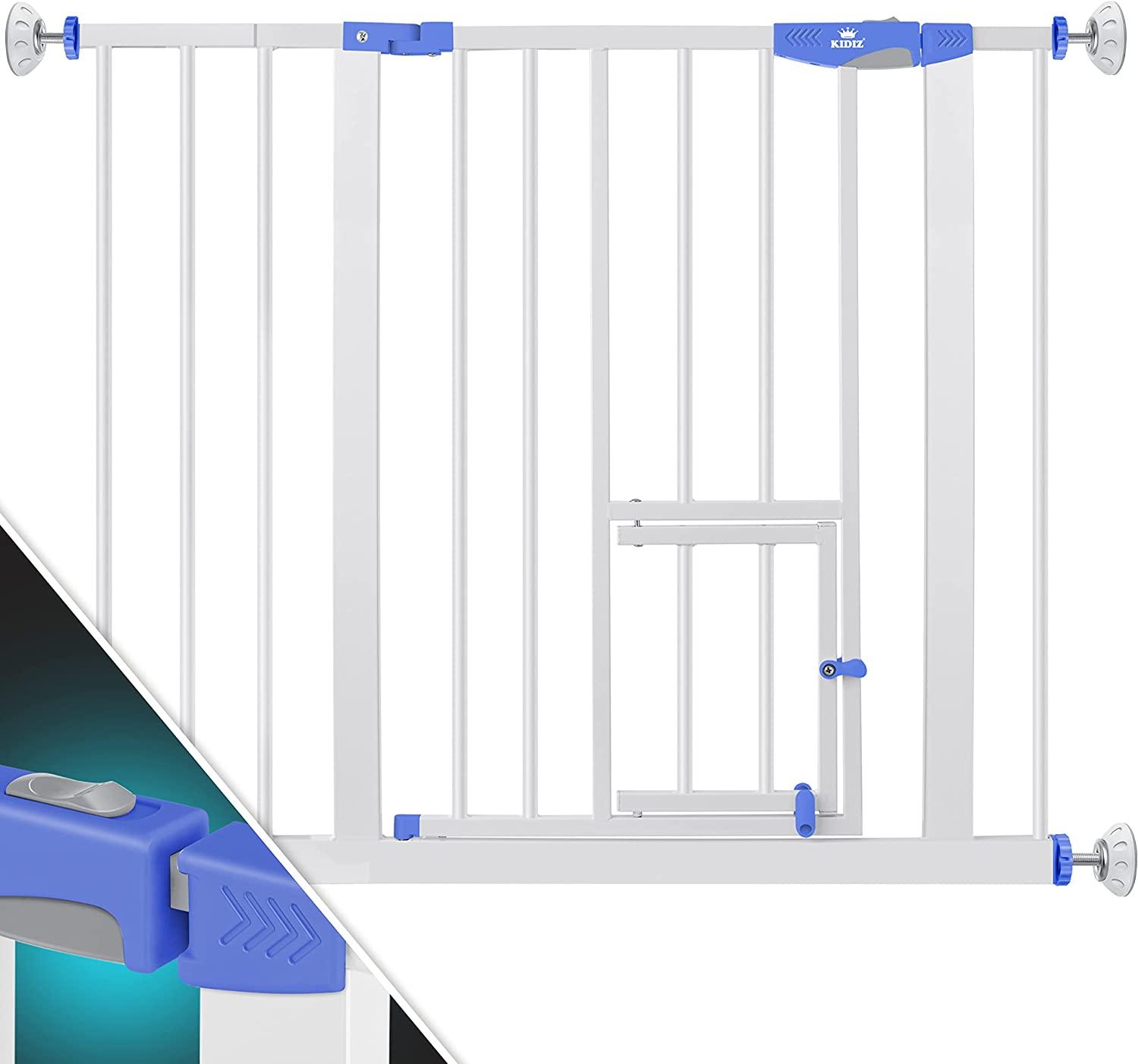 **Aus dem Hause KIDIZ® bieten wir Ihnen heute den optimalen Schutz für Ihre Kinder an.** *KIDIZ - Für unsere Kleinen wird SICHERHEIT groß geschrieben!* Kleine **Kids lieben** es die **Welt** zu **erkunden**. Dabei sind die **Entdeckungstouren grenzenlos**, bietet jedoch **viele Gefahren**. Das **Bügeleisen** ist total **verführerisch** und dennoch kann es ziemlich **gefährlich** sein. **Treppengeländer** laden unsere **Kleinen** oftmals zum **klettern ein**, dabei können sie ziemlich **schnell stürzen**. Schnell ist es passiert und sie **purzeln** schon die **Treppe hinunter** und **stoßen** sich ihren **Kopf** oder ziehen sich **andere Verletzungen** zu.. Unser **Treppenschutzgitter** der **Marke KIDIZ** bietet hier den nötigen **Schutz**, sie **versperren** den **Weg** nach oben oder nach unten und **bremsen** dadurch den **Übermut** unserer **kleinen Forscher**. Mit einem **kindersicheren Verschluss** bleibt ihnen der **Durchgang verwehrt**. **Trotzdem** können **Erwachsene** ganz leicht die **Türen öffnen** ohne sich dabei anzustrengen. **Zusätzlich** können Sie das **Schutzgitter** auch an **Türrahmen** zu bestimmen **Räumlichkeiten befestigen**, falls Sie einen Vierbeiner **Zuhause** haben und ihm **keinen Zutritt gewähren** möchten. Das **Türschutzgitter** überzeugt durch **einfache** und **schnelle Handhabung** und **garantiert** Ihnen für Ihre **Kinder** einen **hohen Schutz**. Dank der **Variantenvielfalt** in jedem **Haus** bzw. jeder **Wohnung anwendbar**. Zusätzlich ist in diesem **Gitter** eine kleine **Türe** für **kleinere Tiere** wie z. B. **Katzen integriert**. Durch diese ist ein **freies Bewegen** durch alle **Räume gewährleistet**. Die **praktische** kleine **Türe** für **Hunde** und **Katzen**, um die **Bereiche** Ihres **Hauses** **abzugrenzen**, die für Ihre Tiere **nicht zugänglich** sein sollen **Produkt-Highlights:** • Höhe ca. 75 cm / Abstand zwischen den Stäben beträgt ca. 6 cm • Mit kleine Türe für Hunde und Katzen • dank 4 Klemmpunkten sicher und stabil z.B. im Türrahmen, zwischen den Wänden etc. • kein Bohren, daher schnelle und einfache Montage • zu öffnen wie eine Tür • Verschluss mit Safety-Button (Sicherheitsknopf) • kann links oder rechts verwendet werden • inklusive Befestigungsmaterial **Technische-Details** • Höhe ca. 75 cm • Abstand zwischen den Stäben ca. 6 cm **Varianten** • 74 -87 cm besteht aus: Basisgitter ohne Verlängerungsteil • 81 - 94 cm besteht aus: Basisgitter + 1 Verlängerungsteil 7 cm • 88 - 101 cm besteht aus: Basisgitter + 1 Verlängerungsteil 14 cm • 102 - 115 cm besteht aus: Basisgitter + 1 Verlängerungsteil 28 cm **Lieferumfang** Lieferumfang (beim Kauf einer Variante 74 - 87 / 81 - 94 / 88 - 101 / 102 - 115cm) • 1x Tür- und Treppenschutzgitter • 1x Befestigungsmaterial • 1x Befestigungsanleitung **FLEXIBEL:** Zu öffnen wie eine Tür, kann links oder rechts verwendet werden, Zusätzlich ist in diesem Gitter eine kleine Türe für kleinere Tiere wie z. B. Katzen integriert. Durch diese ist ein freies Bewegen durch alle Räume gewährleistet. Die praktische kleine Türe für Hunde und Katzen, um die Bereiche Ihres Hauses abzugrenzen, die für Ihre Tiere nicht zugänglich sein sollen. **INDIVIDUELL:** Verschiedene Größenvarianten, so dass Sie passende Gitter für Ihre Bedürfnisse aussuchen können. Verschluss mit Safety-Button (Sicherheitsknopf). **FÜR HAUSTIERE:** Zusätzlich können Sie das Schutzgitter auch an Türrahmen zu bestimmen Räumlichkeiten befestigen, falls Sie einen Vierbeiner Zuhause haben und ihm keinen Zutritt gewähren möchten. **SCHNELLE UND EINFACHE MONTAGE:** Kein Bohren notwendig! Dank der 4 Klemmpunkte ist es einfach und schnell z.B. im Türrahmen oder zwischen den Wänden aufgebaut. Ebenso schnelles abbauen ist kein Problem, bei Nichtgebrauch lässt sich das Türschutzgitter kompakt verstauen. **SICHERHEIT:** Unser Treppenschutzgitter der Marke Kidiz bietet hier den nötigen Schutz, sie versperren den Weg nach oben oder nach unten und bremsen dadurch den Übermut unserer kleinen Forscher. Mit einem kindersicheren Verschluss bleibt ihnen der Durchgang verwehrt. Trotzdem können Erwachsene ganz leicht die Türen öffnen ohne sich dabei anzustrengen.