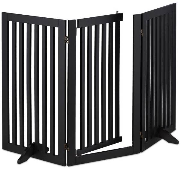 Das schwarze Absperrgitter von Relaxdays bietet eine sichere Lösung, um Kinder oder Hunde in Ihrer Wohnung zu schützen. Mit einer Höhe von ca. 92 cm und einer maximalen Breite von ca. 154 cm ist es flexibel einsetzbar. Das 3-teilige Gitter eignet sich ideal für Treppen, Türen, Kamine und Öfen. Die praktische Tür ermöglicht einen bequemen Durchgang, während das Gitter bei Nichtgebrauch platzsparend zusammengeklappt werden kann. Hergestellt aus stabilem MDF, wird es mit 2 Standfüßen und Bodenschonern geliefert. **Highlights** - Schwarzes Absperrgitter zum Schutz von Hunden oder Kindern in der Wohnung - Flexibles 3-teiliges Schutzgitter mit einer maximalen Breite von ca. 154 cm - Robustes Kindergitter für Treppen, Türen, Kamine, Öfen und mehr - Praktische Tür für einen bequemen Durchgang - Platzsparend zusammenklappbar und leicht zu verstauen **Produkteigenschaften** - Abmessungen (HxB): ca. 92 x 154 cm - Material: MDF - Farbe: Schwarz - Inklusive 2 Standfüßen mit Bodenschonern - Türöffnung (HxB): ca. 86 x 37,5 cm - Gitterabstände (HxB): ca. 81,5 x 3,5 cm - Gewicht: ca. 10,7 kg **Lieferumfang** - 1 x Relaxdays Absperrgitter - 2 x Standfüße mit Bodenschonern - Anleitung - Dekoartikel sind nicht im Lieferumfang enthalten