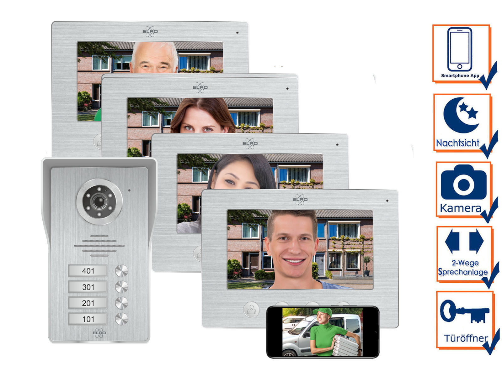 "Optimal für Mehrfamilienhäuser, ermöglicht klare Kommunikation und Sicht auf Besucher durch vier Monitore und eine hochwertige Außeneinheit."