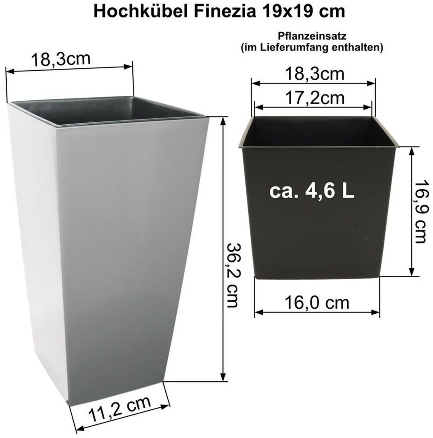 | Lieferumfang | 1x MePla Hochkübel Finezia, 1x Pflanzeinsatz (ohne Bewässerungseinsatz) |