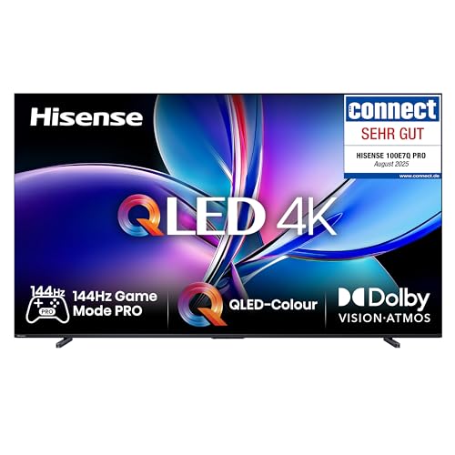 Laut den Testerinnen und Testern von Connect liefert der Hisense 100E7Q Pro ein beeindruckend großes und farbstarkes Bild, das besonders bei Filmen und Games überzeugt. Schwächen zeigt das Gerät jedoch bei der Helligkeit und im Stromverbrauch. – zusammengefasst durch die Testsieger.de-Redaktion