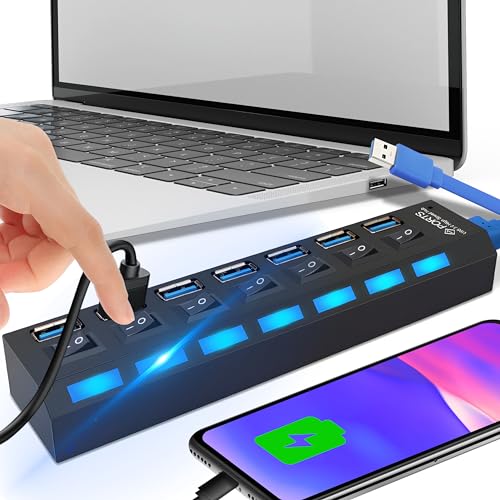 Dieses Produkt ermöglicht eine einfache und effiziente Erweiterung der USB-Anschlüsse, indem es bis zu sieben Geräte gleichzeitig verbindet. Es funktioniert ohne zusätzliches Netzteil, was die Nutzung flexibler macht. Die praktischen Kippschalter für jeden Anschluss sind durch blaue LEDs beleuchtet, sodass jederzeit sichtbar ist, welche Ports aktiv sind.