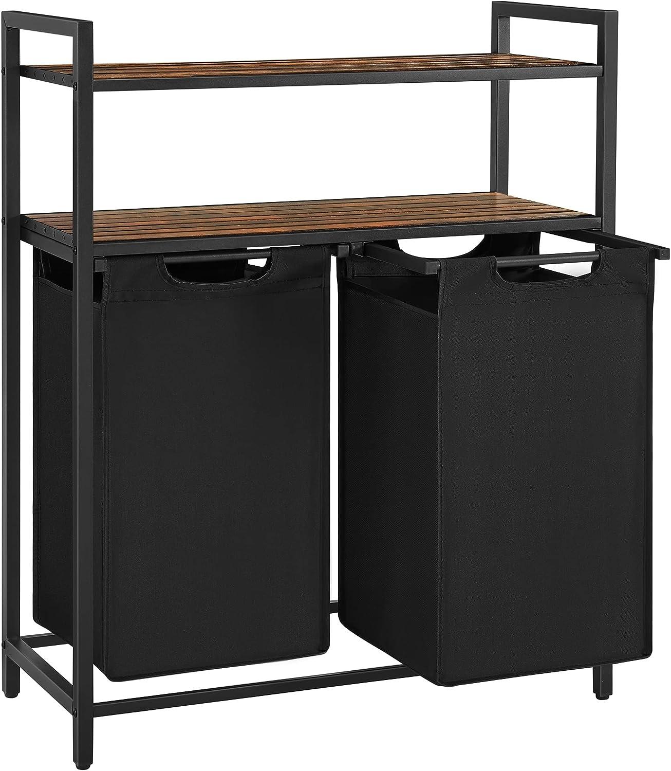- **2 Körbe, 2 Ablagen** – so viel Stauraum! Wäsche nach Farben sortiert in die beiden Körbe (46 Liter/Korb), Badaccessoires, Handtücher oder Waschmittel auf die beiden Ablagen – dieser Wäschesammler bietet genug Platz, um Ihre Sachen ordentlich aufzubewahren - **Wäschesäcke ausziehbar und abnehmbar:** Die Taschen aus Oxford-Gewebe lassen sich herausziehen und dank der praktischen Klettverschlüsse einfach abnehmen, sodass Sie Ihre Wäsche problemlos zur Waschmaschine tragen können - **Gute Stabilität:** Robustes Stahlgestell, hochwertige MDF-Platten, verstellbare Füße, Kippschutz – all dies verleiht diesem Wäschekorb Stabilität (obere Ablage bis 27 kg, untere Ablage bis 18 kg, 8 kg Belastbarkeit pro Korb) - **Einfache Montage:** Der Wäschesortierer lässt sich dank einer bebilderten, leicht verständlichen Anleitung und der gekennzeichneten Teile unkompliziert aufbauen - **Ein vielseitiger Alltagshelfer:** Der Wäschekorbsammler mit 2 Fächern und 2 Ablagen passt gut in die Waschküche, ins Badezimmer oder Schlafzimmer und hilft Ihnen, Wäsche im Verborgenen zu halten und benötigte Utensilien griffbereit aufzubewahren **Produktdetails:** - Farbe: Vintagebraun-Schwarz - Material: MDF (Mitteldichte Faserplatte), Stahl, Oxford-Gewebe - Größe insgesamt: 73 x 33 x 91 cm (L x B x H) - Größe pro Tasche: 30 x 30 x 51 cm (L x B x H) - Gewicht: 9,3 kg - Max. statische Belastbarkeit obere Ablage: 27 kg - Max. statische Belastbarkeit untere Ablage: 18 kg - Max. statische Belastbarkeit pro Tasche: 8 kg **Lieferumfang:** - 1 x Wäschekorb - 2 x Kippschutz - 1 x Zubehörpaket - 1 x Anleitung **VASAGLE Hinweise:** - Kindern ist es aus Sicherheitsgründen untersagt, auf das Produkt zu klettern oder damit zu spielen. - Bitte befestigen Sie dieses Produkt mit dem beiliegenden Kippschutz an der Wand, um eine sichere Nutzung zu gewährleisten. - Setzen Sie sich bitte nicht auf den Wäschesammler, um ein Umkippen des Produktes zu vermeiden. - Seien Sie bitte vorsichtig, wenn Sie die Wäschekörbe herausziehen und hineinschieben, um ein Einklemmen der Finger zu vermeiden. - Die Stofftaschen sind nicht für eine Maschinenwäsche geeignet.