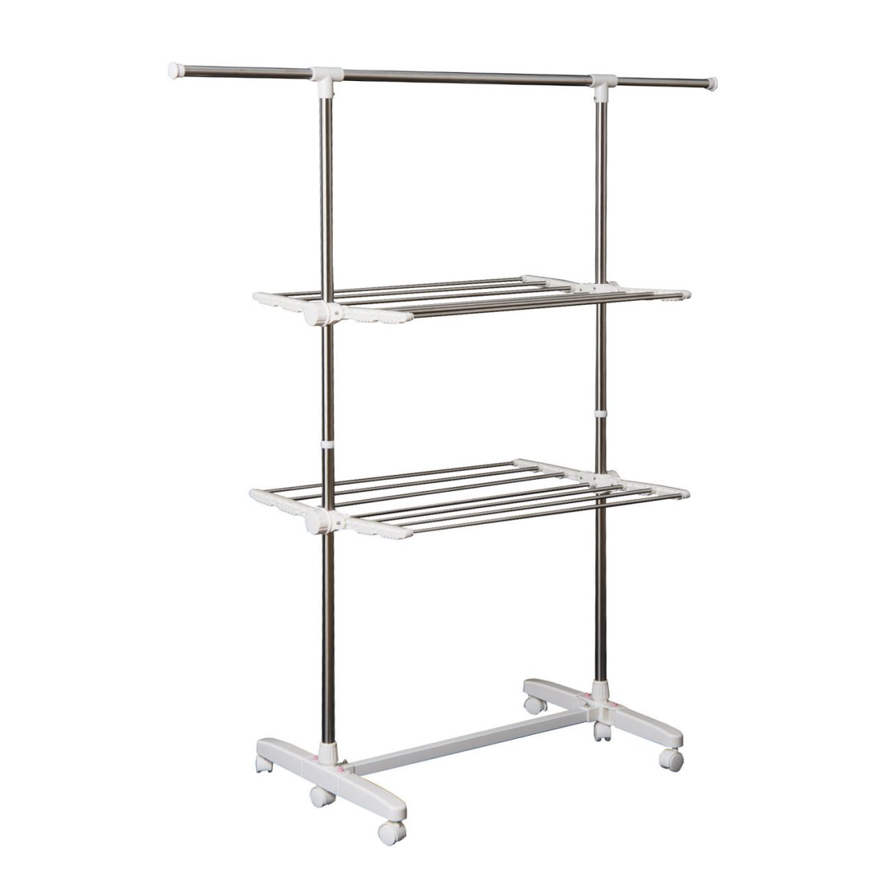 Der mobile Wäscheständer von HOMCOM bietet eine praktische Lösung für das Trocknen Ihrer Kleidung. Dank seiner klappbaren Seitenflügel auf zwei Ebenen ermöglicht er eine platzsparende Aufbewahrung und bietet gleichzeitig eine große Kapazität für Ihre Wäsche. Die Mobilität des Ständers wird durch Rollen gewährleistet, was Ihnen die Flexibilität gibt, ihn überall dort zu positionieren, wo Sie es benötigen.