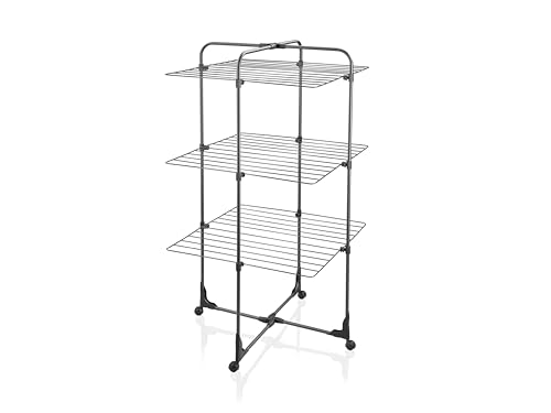 Mit 27 m Trockenlänge und mobilen Rollen eignet sich der Turmtrockner perfekt für begrenzte Wohnräume.