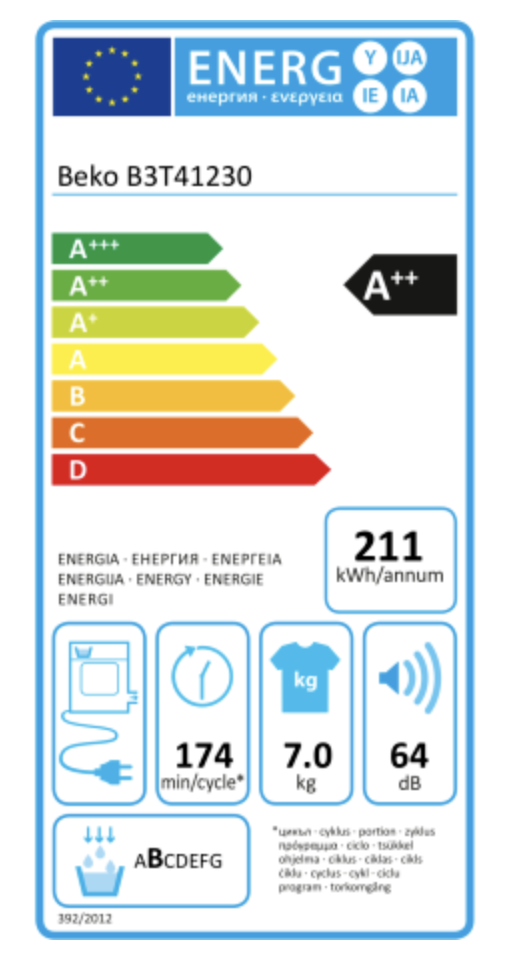 | Gewichteter jährlicher Energieverbrauch (AE c) in kWh (160 Standard-Trocknungszyklen) | 211 kWh/Jahr |