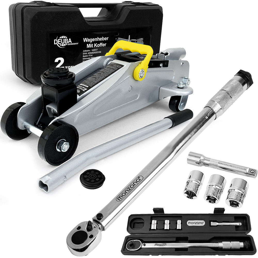 Das Deuba Reifenwechselset bietet eine praktische Lösung für den Wechsel von Autoreifen. Mit einem hydraulischen Wagenheber mit einer Tragkraft von 2 Tonnen, einer Gummiauflage und einem Drehmomentschlüssel im Set ist das Wechseln von Reifen schnell und einfach erledigt.