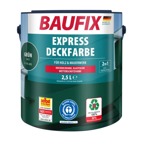 Die Baufix Express Deckfarbe in grün zeichnet sich durch eine hohe Deckkraft und einfache Verarbeitung aus. Sie trocknet schnell und ist sehr ergiebig, was sie ideal für Holzoberflächen macht. Kunden schätzen die Farbbeständigkeit und das gute Preis-Leistungs-Verhältnis. Ein Nachteil ist die eingeschränkte Farbwahl.