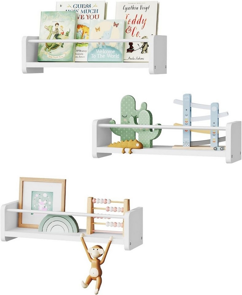 Woltu Wandregal im 3er Set bietet eine elegante und praktische Lösung zur Aufbewahrung und Präsentation Ihrer Lieblingsgegenstände. Mit einer Tragfähigkeit von 5 kg pro Regal und abgerundeten Ecken ist es sowohl funktional als auch sicher. Die Montage ist flexibel, da zwei Montagemöglichkeiten zur Verfügung stehen. Die Oberfläche ist leicht zu reinigen und das Regal nutzt die Wandfläche optimal aus, ohne Platz auf dem Boden einzunehmen. **Highlights** - Set aus 3 Wandregalen: Bietet reichlich Stauraum für Sammlerstücke und andere Gegenstände. - Metallstopper: Schützt vor dem Herunterfallen und verleiht eine moderne Note. - Abgerundete Ecken: Sicher in der Anwendung, ideal für Kinderzimmer. - Platzsparend: Nutzt die Wandfläche optimal aus. - Leicht zu reinigen: Wasserabweisendes Melaminfurnier für einfache Pflege. **Produkteigenschaften** - Materialien: MDF der Klasse E1, Spanplatte, Metall - Farbe: Weiß - Abmessungen pro Regal: 40 x 10 x 12 cm (B x H x T) - Nettogewicht: ca. 2,3 kg - Tragfähigkeit: 5 kg pro Regal - 2 Montagemethoden: Metallstange nach unten oder oben montierbar **Lieferumfang** - 1x Set mit 3 Hängeregalen - 1x Montageanleitung - 1x Zubehörset - Alle anderen Artikel sind nicht im Paket enthalten.