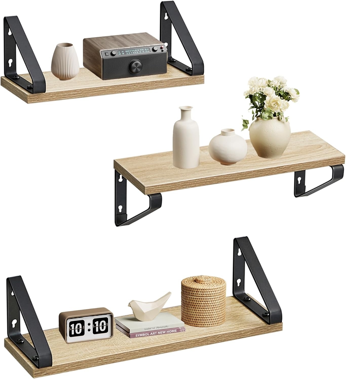 Schaffen Sie mit dem VASAGLE Wandregal im 3er Set eine stilvolle Präsentationsfläche für Ihre Dekorationsstücke. Die Kombination aus eichenfarbener Ablage und schwarzen Stahlhalterungen verleiht Ihrem Zuhause Charakter. Mit zwei Montagemöglichkeiten können Sie die Regale kreativ anpassen. Dank der stabilen Konstruktion aus hochwertigen Materialien tragen die Regale jeweils bis zu 10 kg und sind einfach zu montieren. **Highlights** - Schlichtes Design mit eichenfarbener Ablage und schwarzen Stahlhalterungen - Vielseitig einsetzbar für Wohnzimmer, Küche, Arbeitszimmer und Badezimmer - 2 Montagemöglichkeiten für kreative Gestaltung - Stabil und langlebig mit einer Tragkraft von bis zu 10 kg pro Regal - Einfache Montage mit beiliegender bebilderter Anleitung **Produkteigenschaften** - 3er Set Wandregale - Material: Spanplatten und Stahl - Farbe: eichenfarben-schwarz - Tragkraft: bis zu 10 kg pro Regal - Montagemöglichkeiten: nach oben oder unten