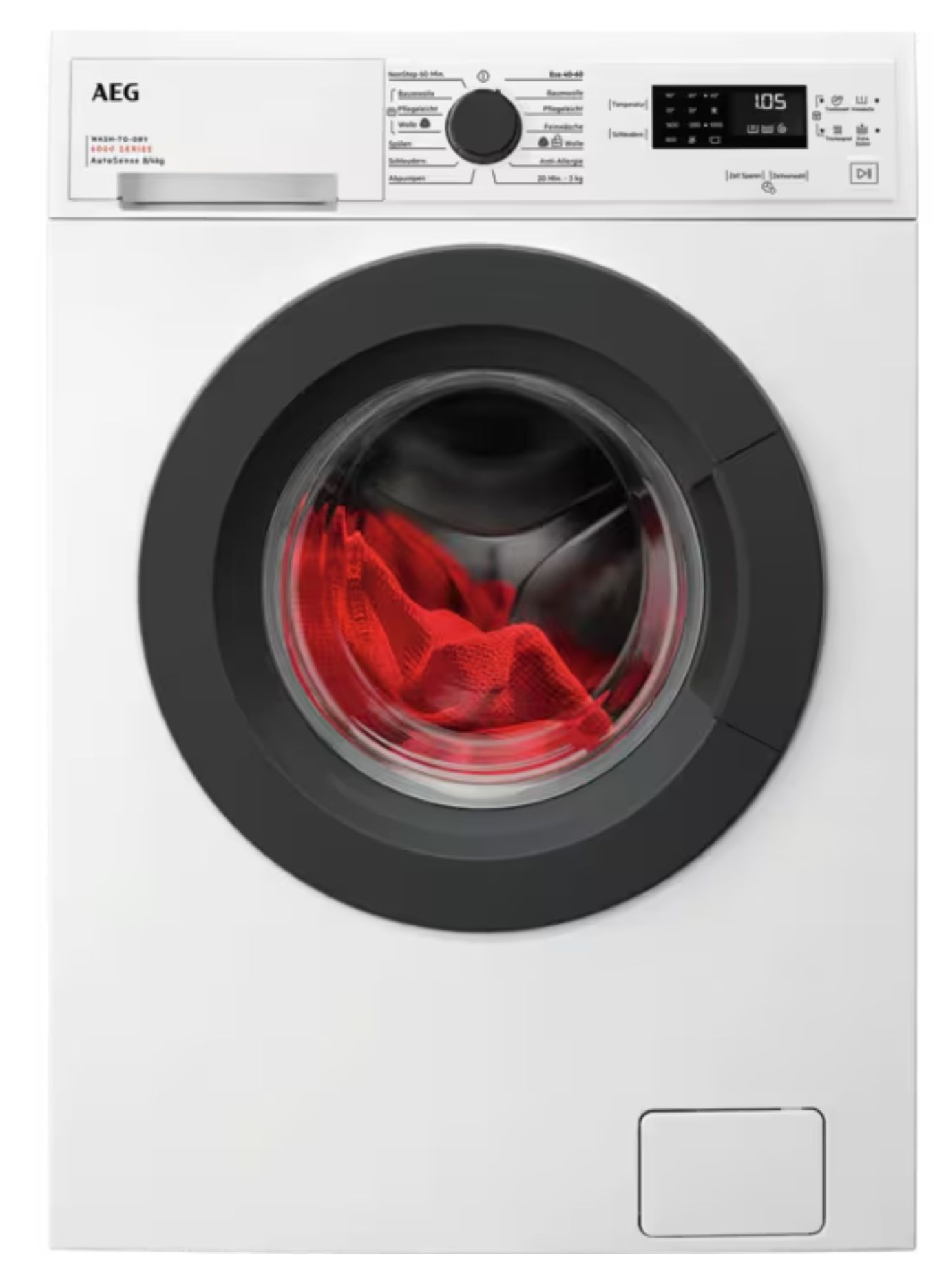 Innenraum Edelstahl, Heizelement verdeckt, Eco-Funktion, Display LED, Unwuchtkontrolle, Bedienung Drehregler & Elektroniktasten, Höhenverstellbare Füße, Signalton nach Programmablauf