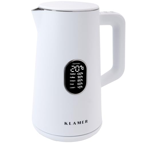 Der KLAMER Wasserkocher Edelstahl 1 wird als einfaches, robustes Gerät gelobt, das gut funktioniert. Die digitale Wassergrad-Anzeige und akustischen Hinweistöne werden positiv erwähnt.