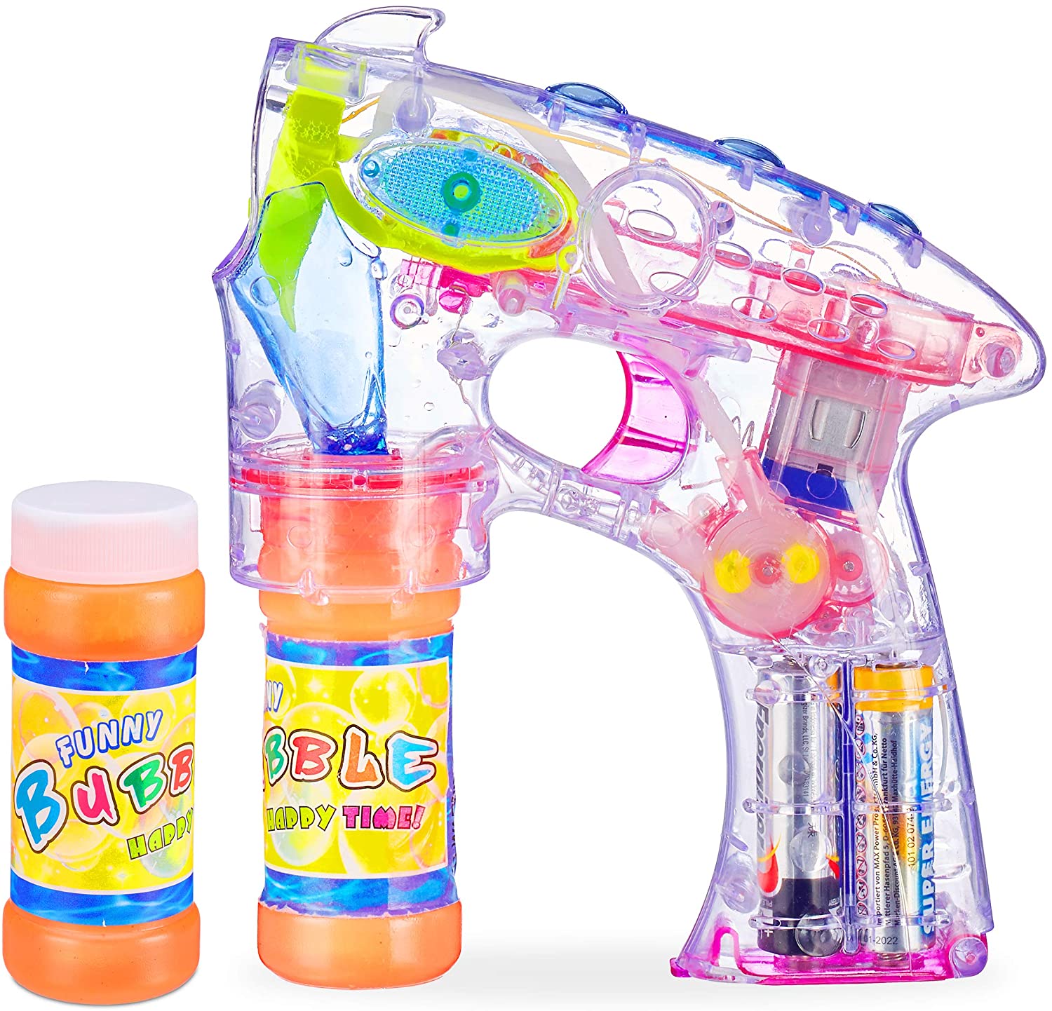 | Name | Relaxdays 10024937 Seifenblasenpistole LED, batteriebetrieben, mit 2X Seifenblasen Flüssigkeit, Kinder & Erwachsene, transparent |