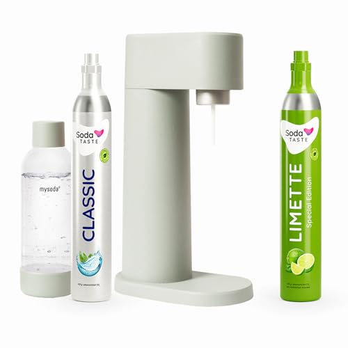 SodaTASTE Sparpaket: Mysoda Woody - Wassersprudler aus erneuerbarem Holzkomposit mit 1L BPA-freier PlastikflascheCO2-Zylinder Classic + CO2-Zylinder Limette (Pigeon, Salbei)