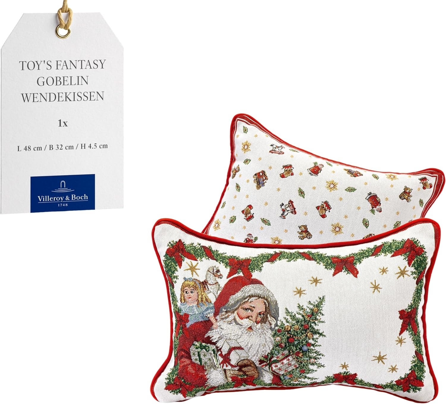 **Villeroy & Boch Toy’s Fantasy Kissen 48 x 32 cm – festliches Dekokissen mit Spielzeugmotiv aus Baumwolle** Mit dem Toy’s Fantasy Kissen von Villeroy & Boch zieht weihnachtlicher Zauber in Ihr Zuhause ein. Das liebevoll gestaltete Gobelin-Kissen mit fröhlichem Spielzeugmotiv verleiht Ihrem Wohnraum einen nostalgischen Charme und sorgt für eine stimmungsvolle Atmosphäre in der Advents- und Weihnachtszeit. Ob auf dem Sofa, dem Sessel oder der Bank – dieses Kissen wird garantiert zum Blickfang Ihrer festlichen Dekoration. Die detailreichen Motive in warmen, weihnachtlichen Farben lassen sich perfekt mit anderen Artikeln der Toy’s Fantasy Kollektion kombinieren und harmonieren ebenso mit weiteren Weihnachtsserien von Villeroy & Boch. So entsteht ein einheitlich festliches Gesamtbild, das Ihre Einrichtung stilvoll abrundet. Gefertigt aus hochwertiger Baumwolle überzeugt das Kissen durch seine angenehme Haptik, Formstabilität und Langlebigkeit. Es ist nicht nur ein dekoratives Highlight, sondern auch ein gemütlicher Begleiter in der kalten Jahreszeit. **Artikeldetails:** Farbe: Bunt Material: Baumwolle Form: Rechteckig Maße: ca. 48 × 32 cm Höhe: ca. 4,5 cm