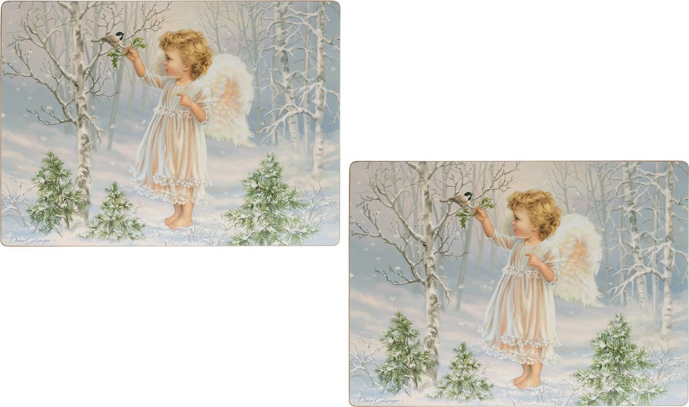 Ein niedlicher Engel trifft im verschneiten Wald auf eine herrliche singende Meise. Das Platzset ist ein toller Anblick am Esstisch.