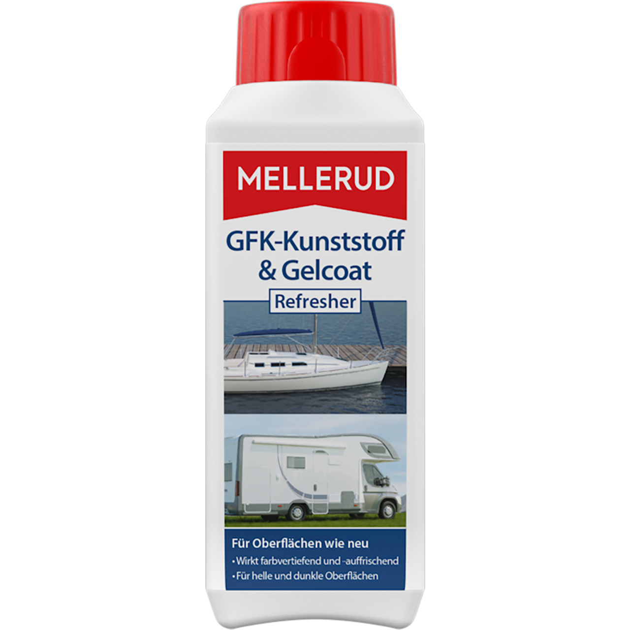 Das Mellerud GFK-Kunststoff & Gelcoat Refresher ist ein Produkt zur Reinigung und Aufbereitung von Kunststoff- und GFK-Oberflächen. Es zeigt gute Ergebnisse bei der Beseitigung von Flecken und kleinen Kratzern, kann jedoch bei einigen Anwendungen weiße Streifen hinterlassen und nicht alle Oberflächen aufhellen.