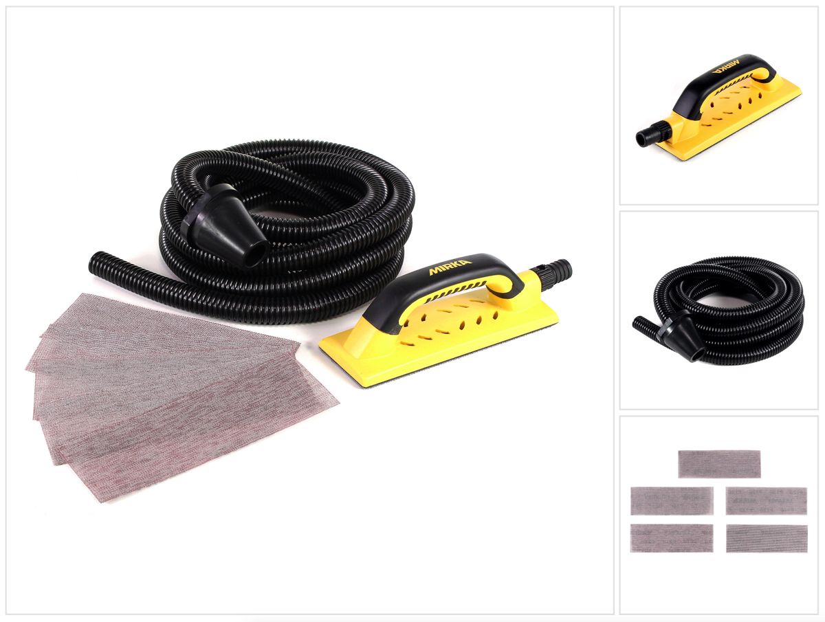 | Lieferumfang | 1x Mirka Handy Handblock- 1x Mirka ABRANET 80x230mm Grip P 80 - 1x Mirka ABRANET 80x230mm Grip P 180- 3x Mirka ABRANET 80x230mm Grip P 120- 1x Absaugschlauch / DIY 20mm x 4m mit konischem Adapter |