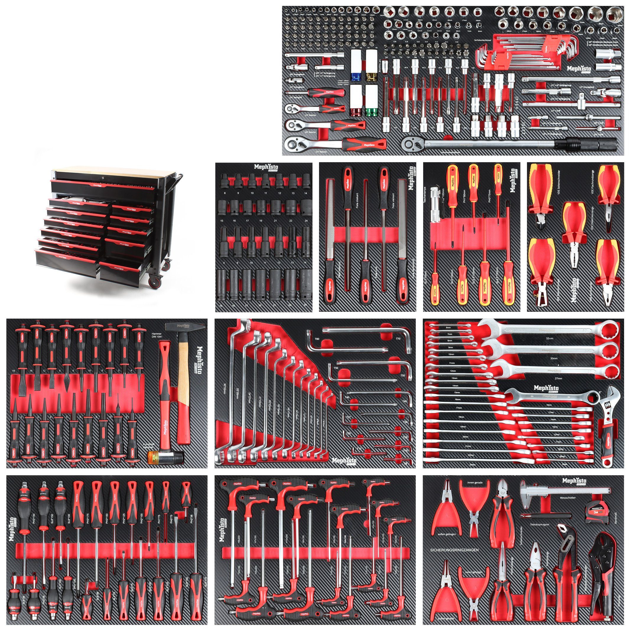 Mephisto-Tools Werkstattwagen Pro-Line 12 abschließbare Schubladen, CRV Werkzeug, schwarz/rot
