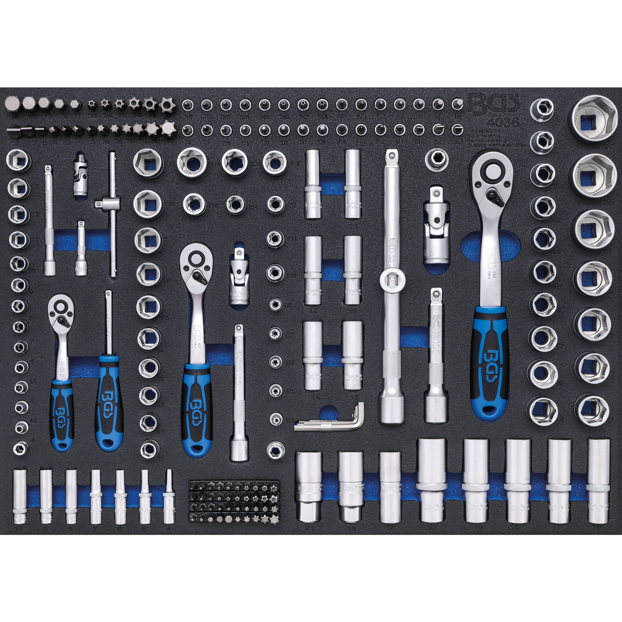 Die BGS 4036 Werkstattwageneinlage bietet mit ihrem umfangreichen 192-teiligen Steckschlüssel-Satz einen vielseitigen Nutzen für Heimwerker und Profis gleichermaßen. Dank des guten Preis-Leistungs-Verhältnisses erhalten Kunden ein robustes Werkzeugset, das ihnen bei verschiedenen Anwendungen zur Seite steht.