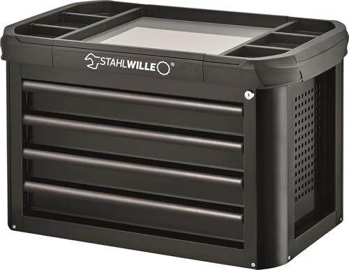 • Die Stahlwille Werkzeugbox, Aufsatztruhe 93 TOP BOX, hat eine robuste Stahlblechkonstruktion und eine strapazierfähige Kunststoffablageplatte aus ABS mit Fächern